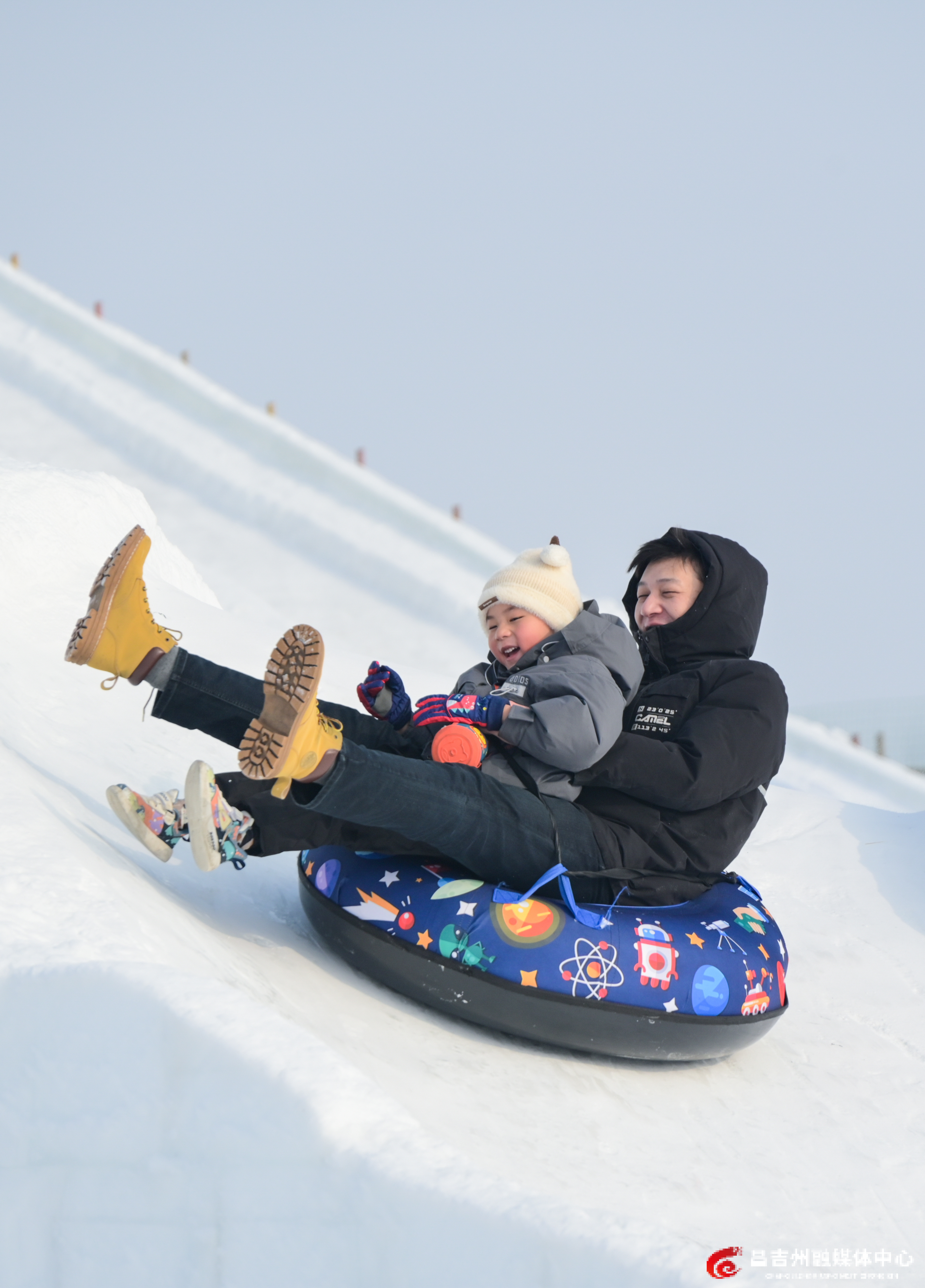 1月11日,昌吉市庭州生态绿谷“丝路冰城”冰雪大世界,游客在滑雪圈。