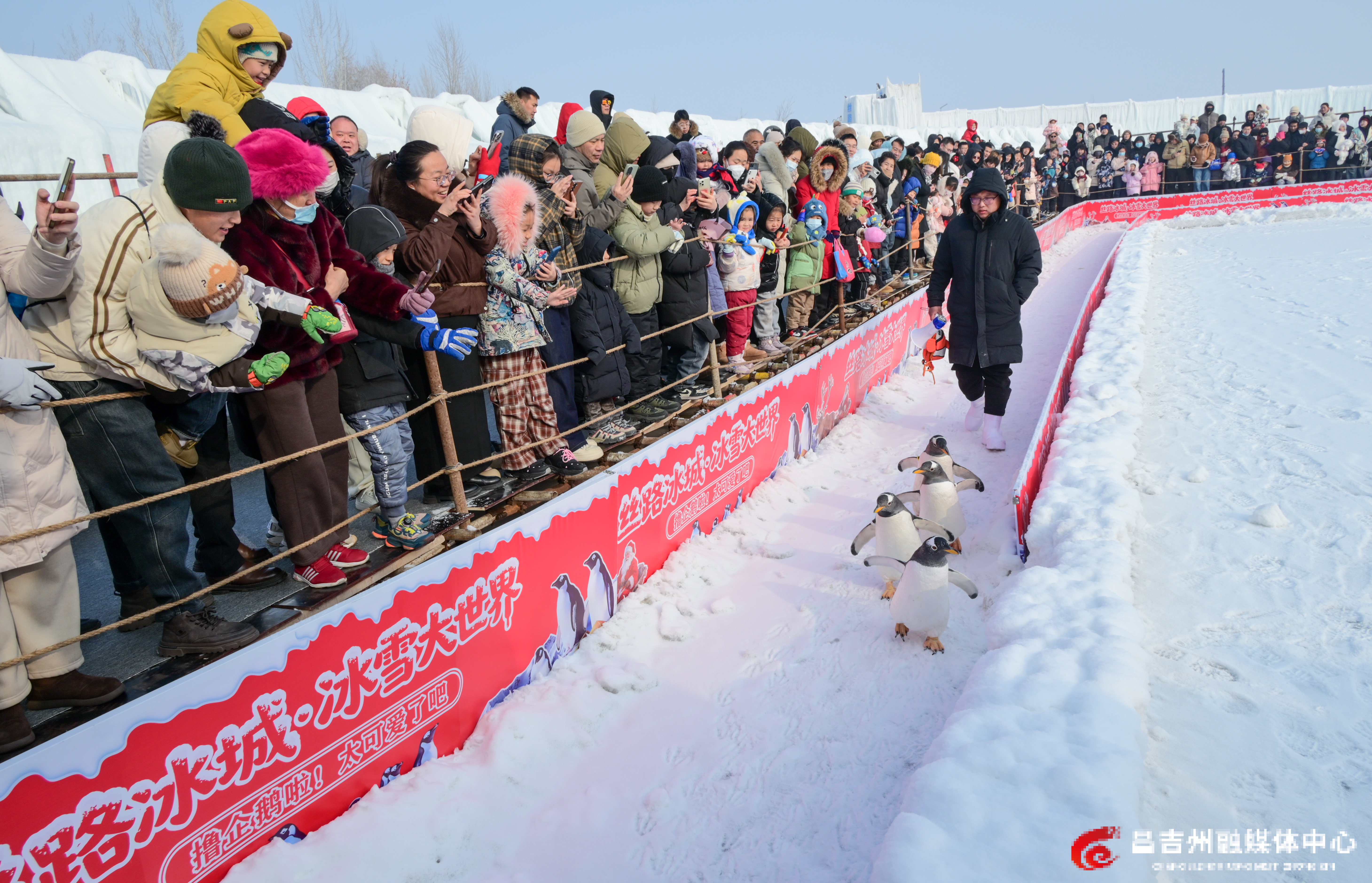 1月11日,昌吉市庭州生态绿谷“丝路冰城”冰雪大世界,憨态可掬的企鹅吸引众多游客竞相拍照。