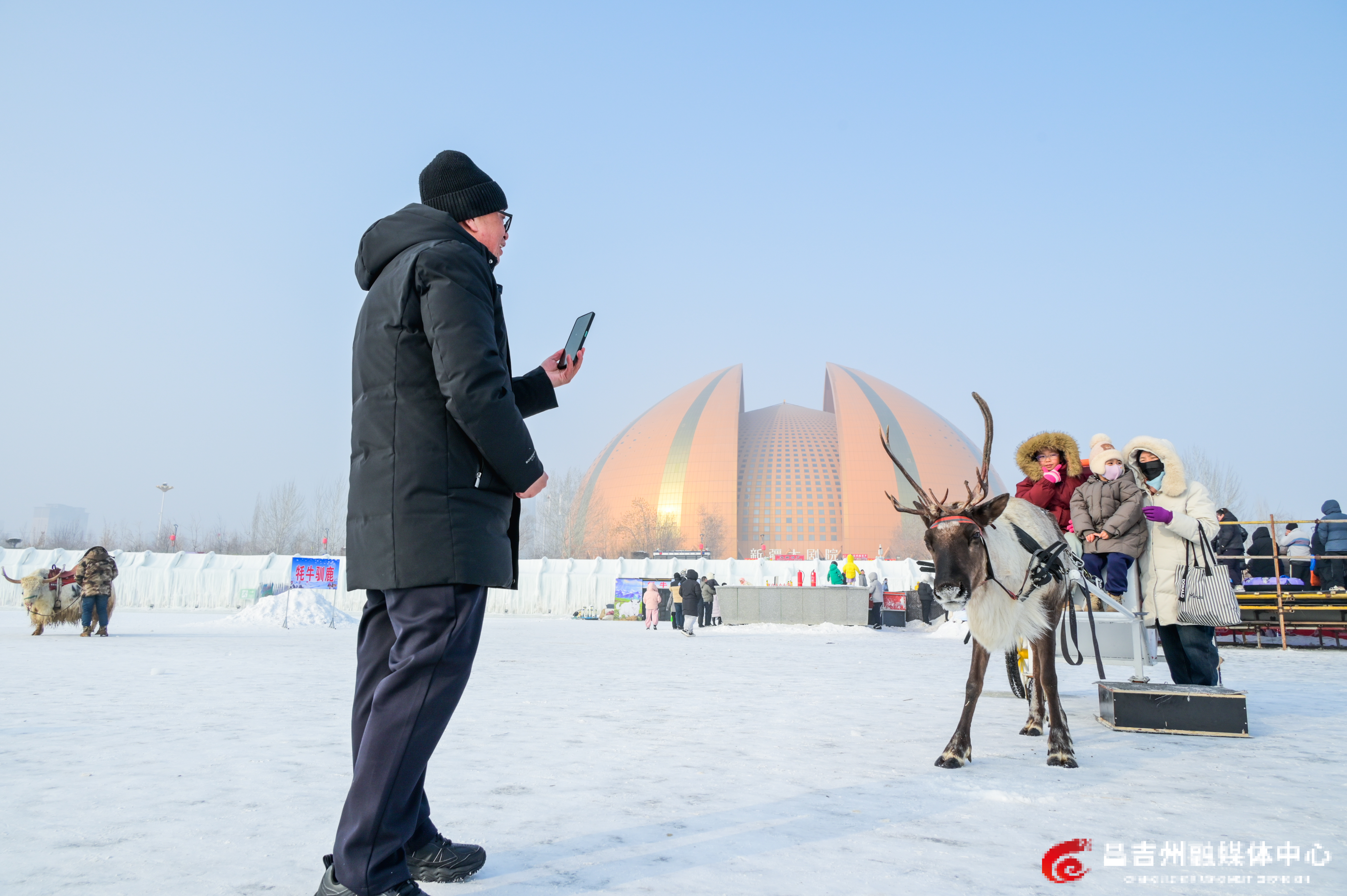 1月11日,昌吉市庭州生态绿谷“丝路冰城”冰雪大世界,游客在驯鹿互动区打卡拍照。