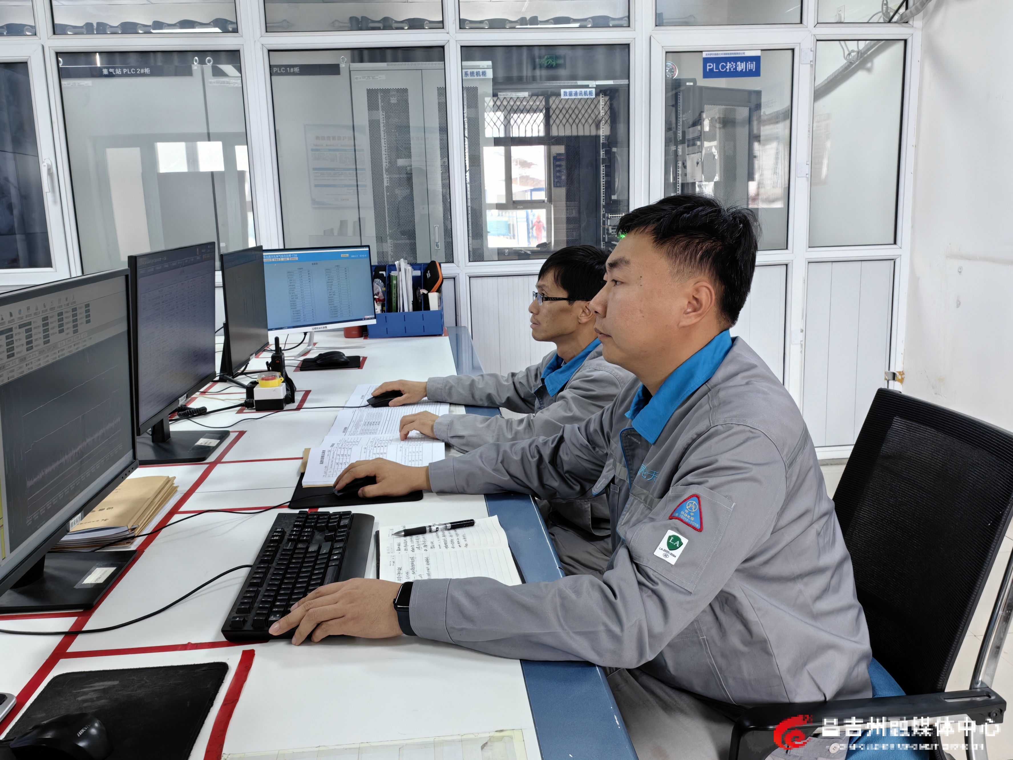 2月4日,吉木萨尔县昆仑天泽新能源有限责任公司巡检工在水溪沟煤层气项目门站集控室内查看监控画面和生产数据。