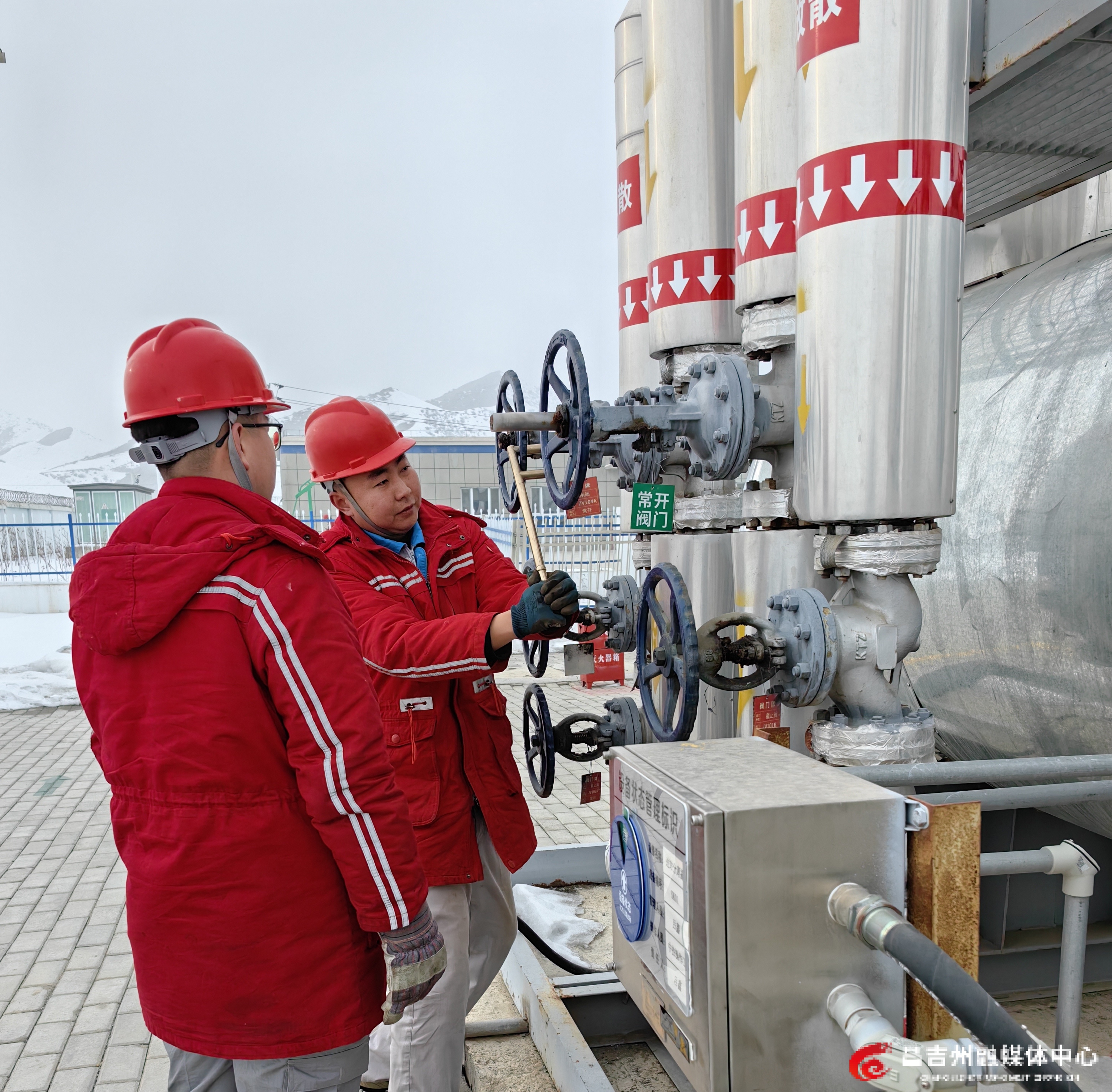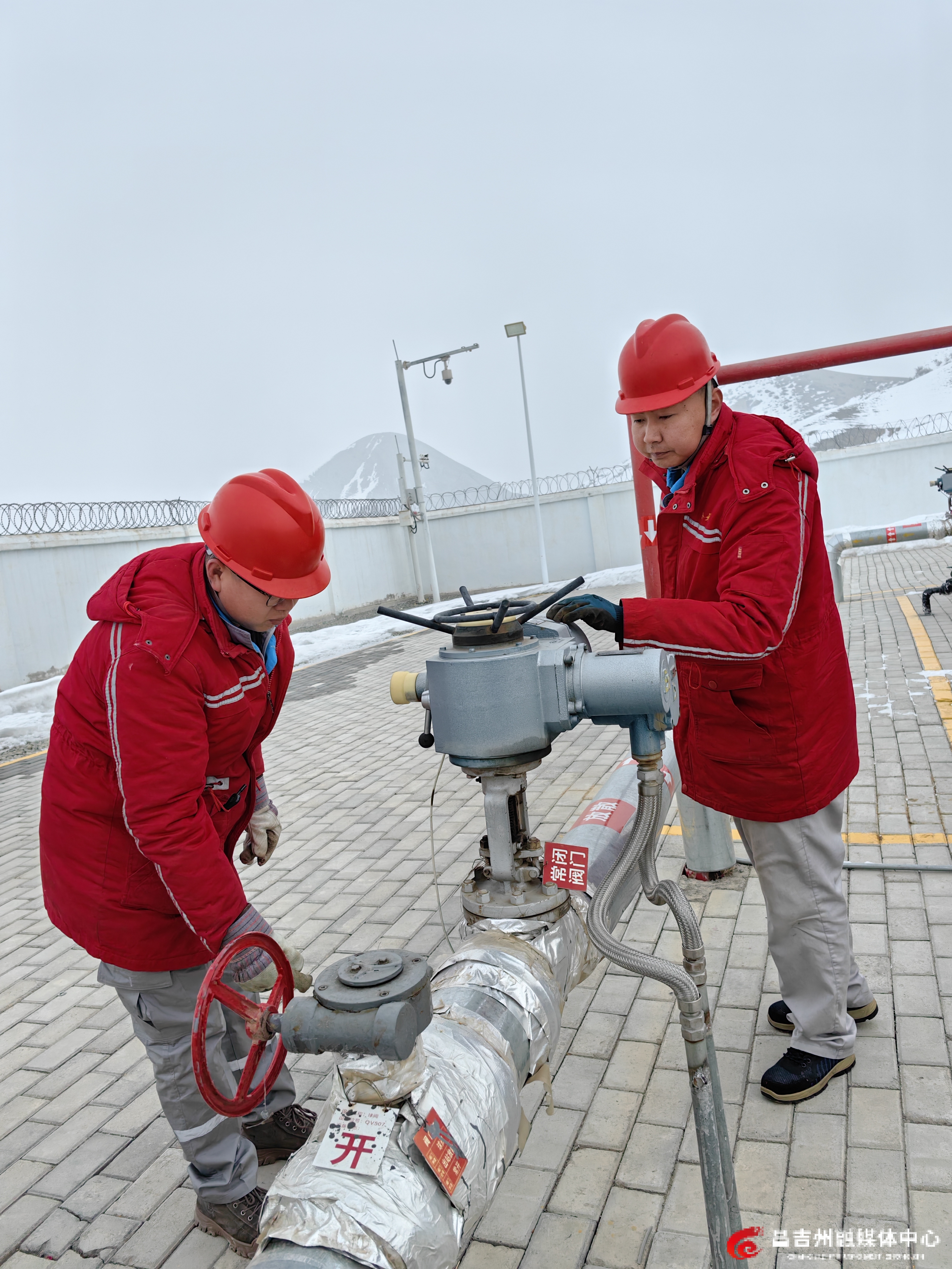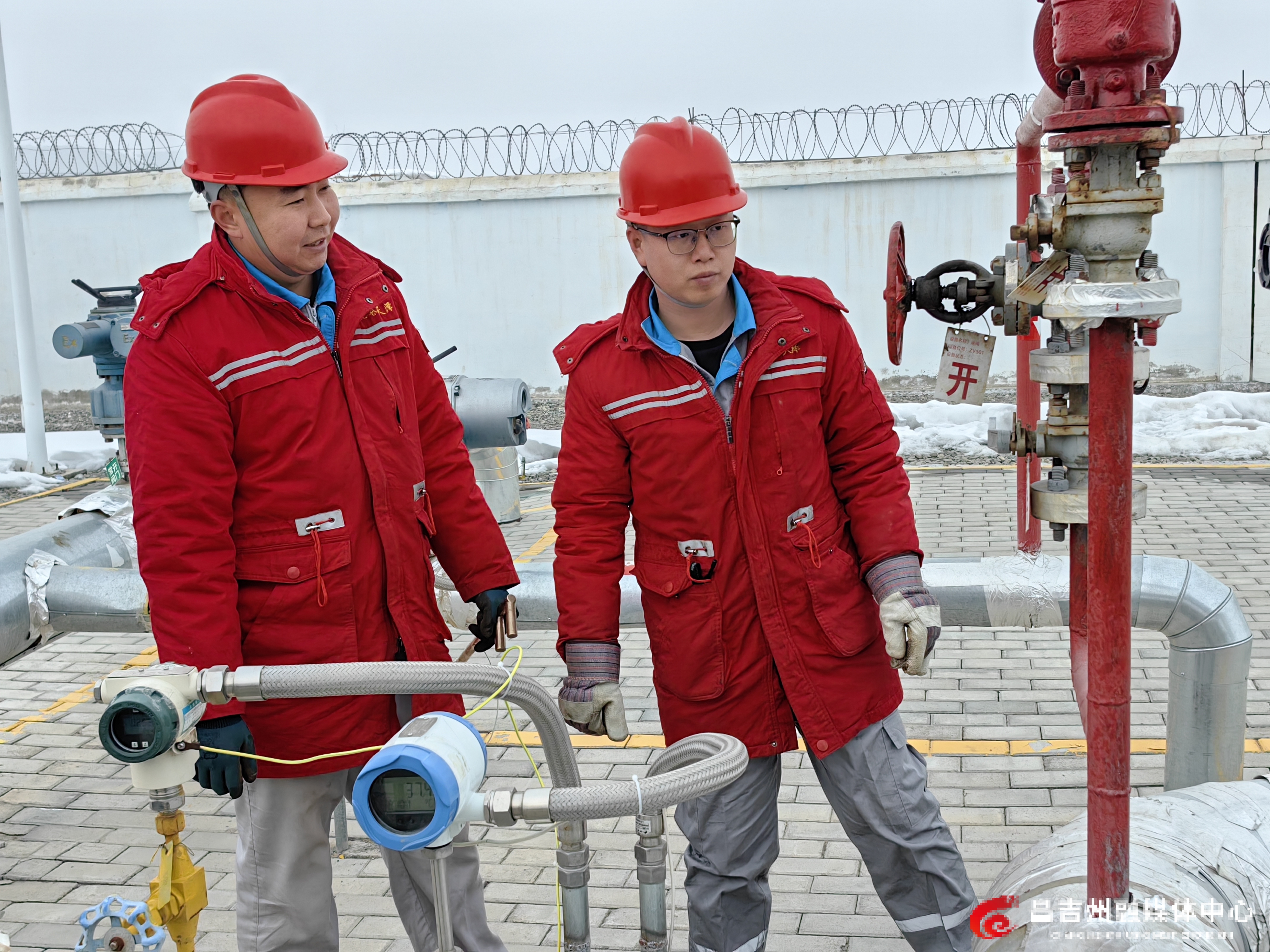 2月4日,吉木萨尔县昆仑天泽新能源有限责任公司巡检工对煤层气生产运输设备和仪表进行巡检。