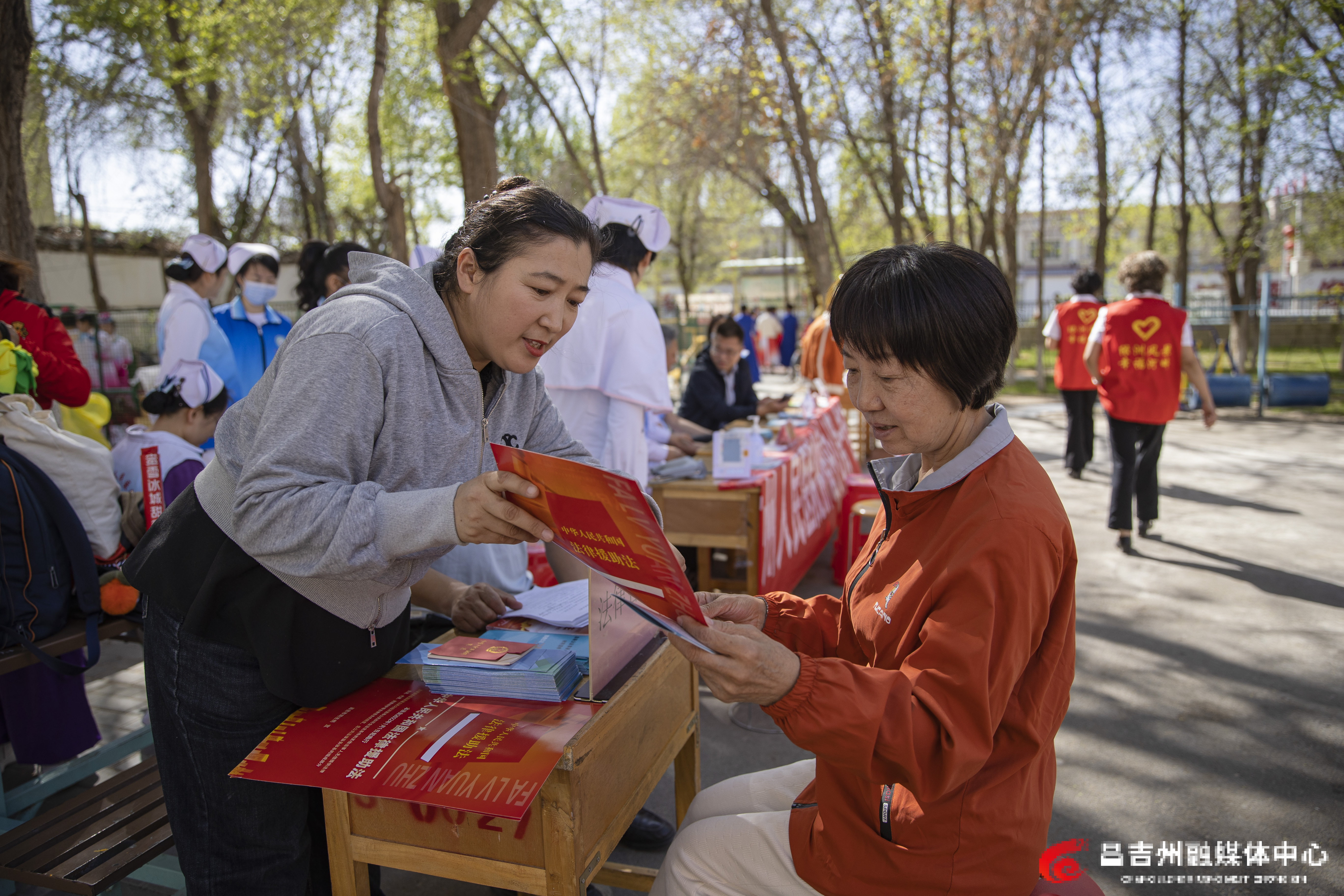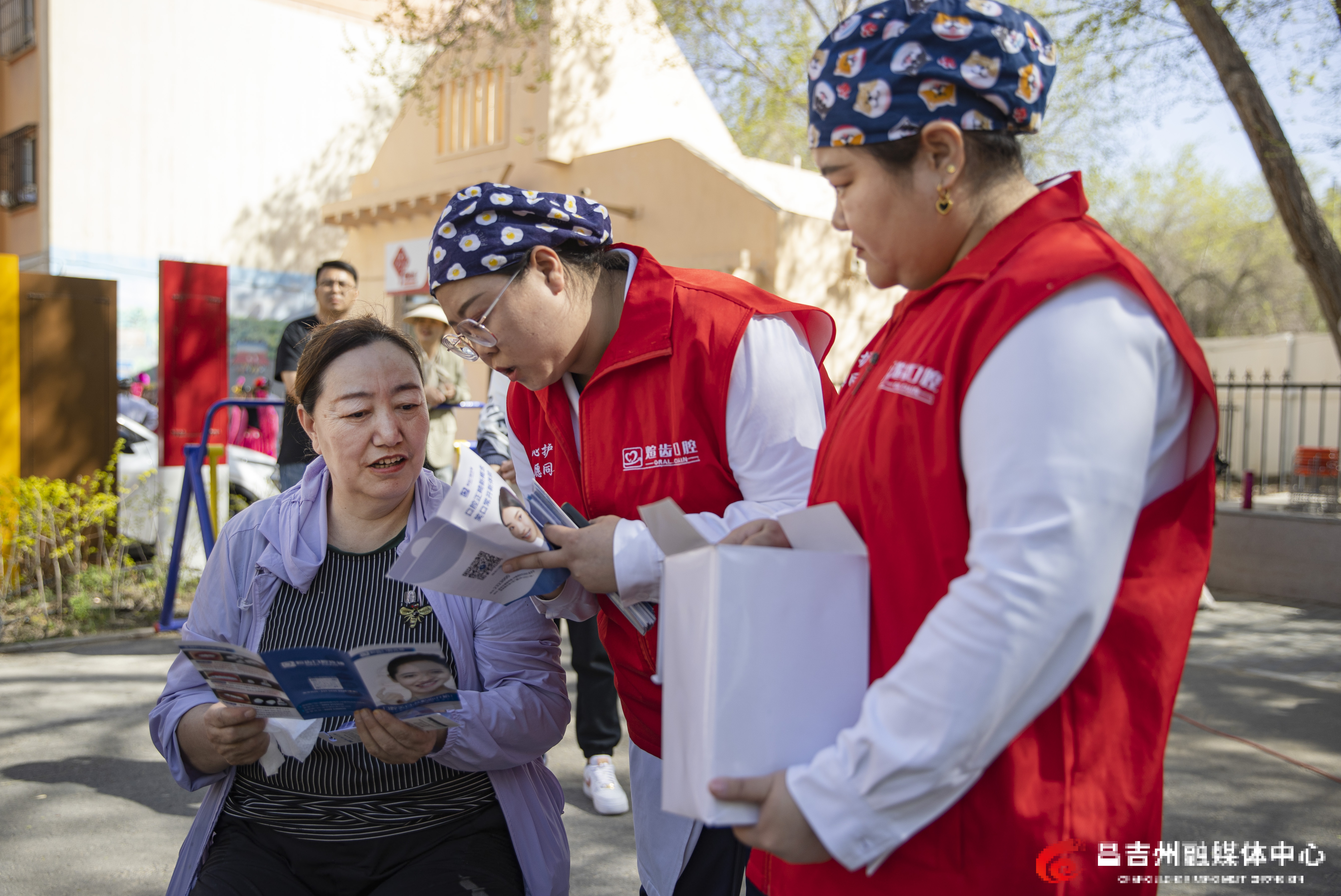 4月13日,在昌吉市绿洲路街道香槟社区建设花园网格党群服务驿站,医护人员向居民开展口腔健康科普宣传。