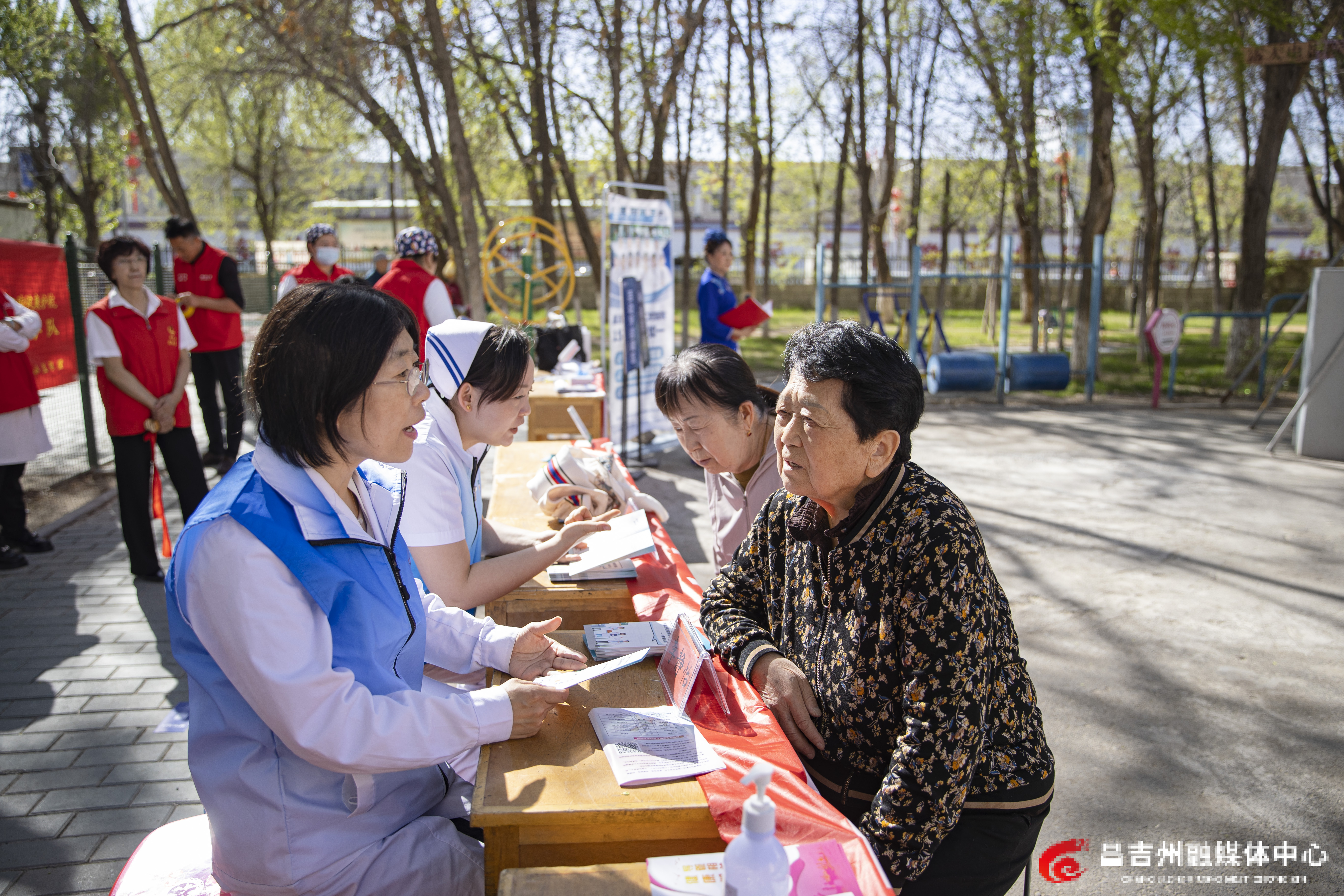 4月13日,在昌吉市绿洲路街道香槟社区建设花园网格党群服务驿站,医护人员一对一为居民提供健康指导。