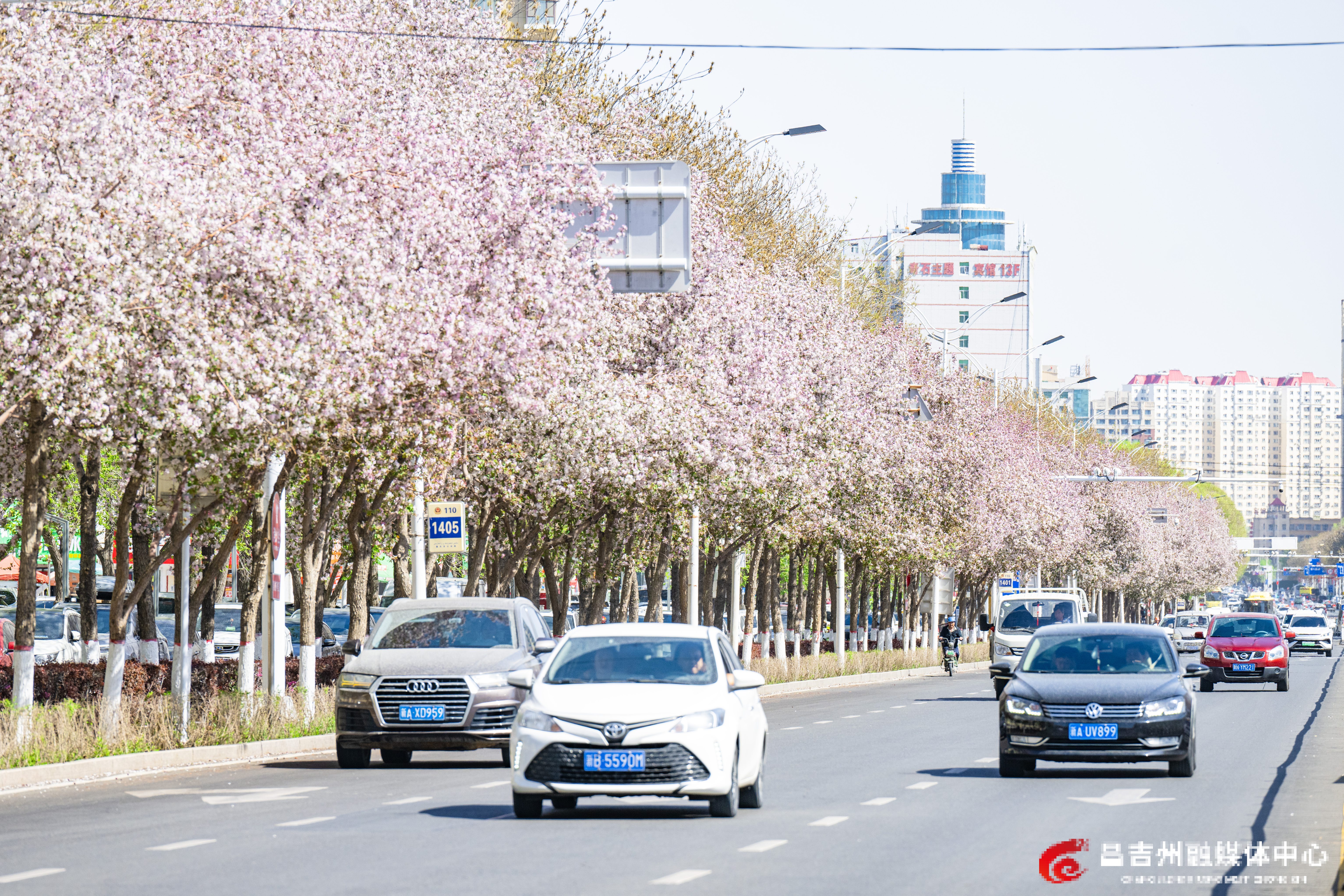 4月15日,昌吉市长宁南路道路两旁的红叶海棠盛开,扮靓城市。