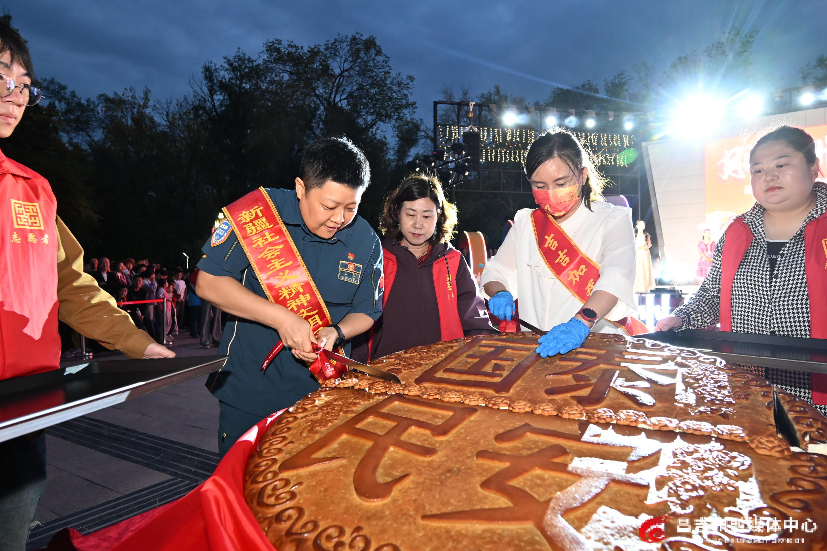 10月1日,昌吉市人民公园,道德模范代表共同切巨型月饼。