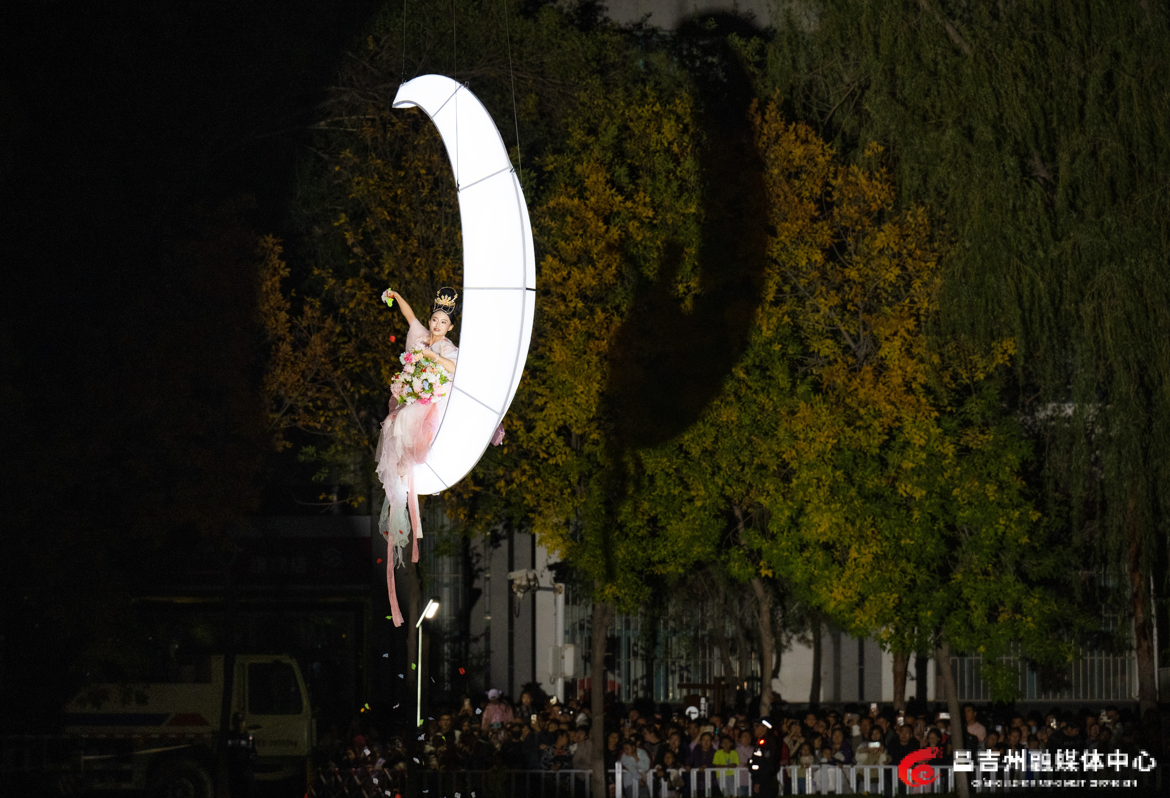 10月1日,昌吉市人民公园,市民在观看“嫦娥奔月”表演。