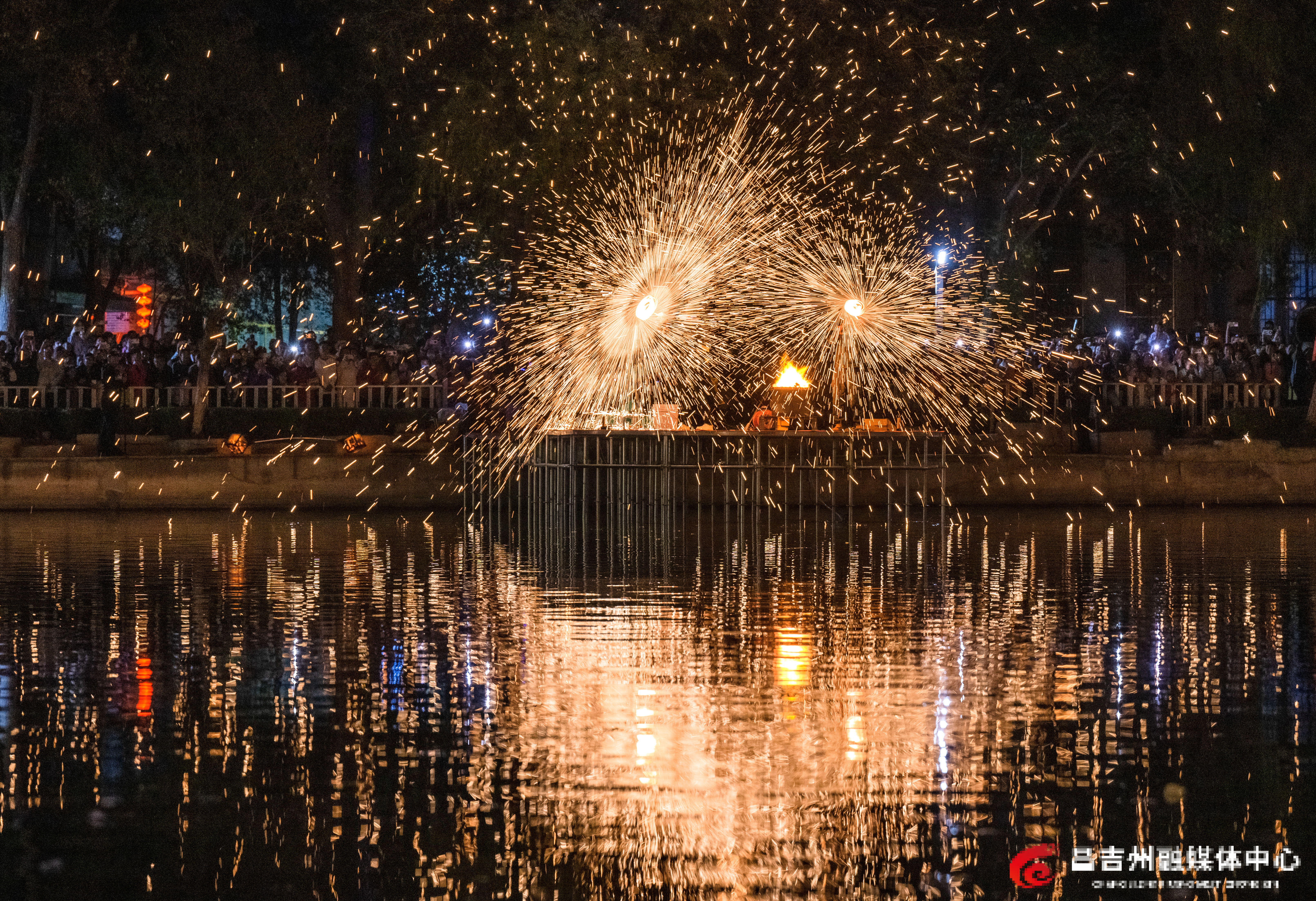 10月1日,昌吉市人民公园,市民在观看打铁花表演。