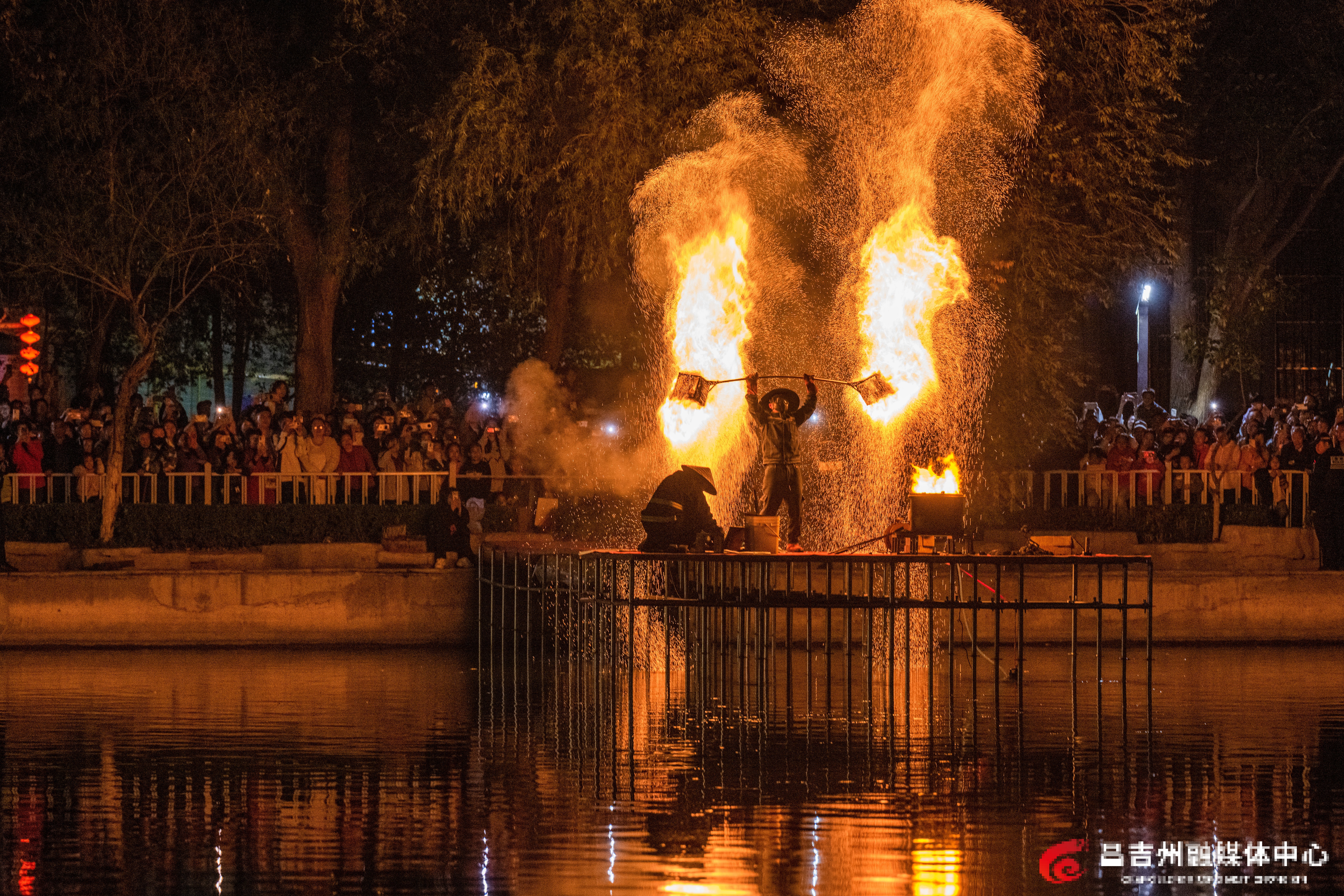 10月1日,昌吉市人民公园,市民在观看火壶表演。
