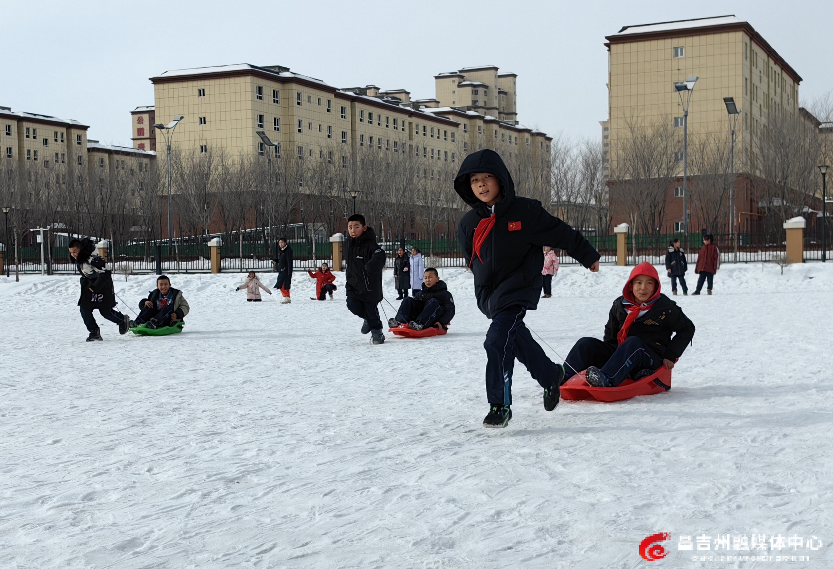1月16日,在奇台县奇台福州中学室外运动场,学生正在进行拉滑雪板比赛。