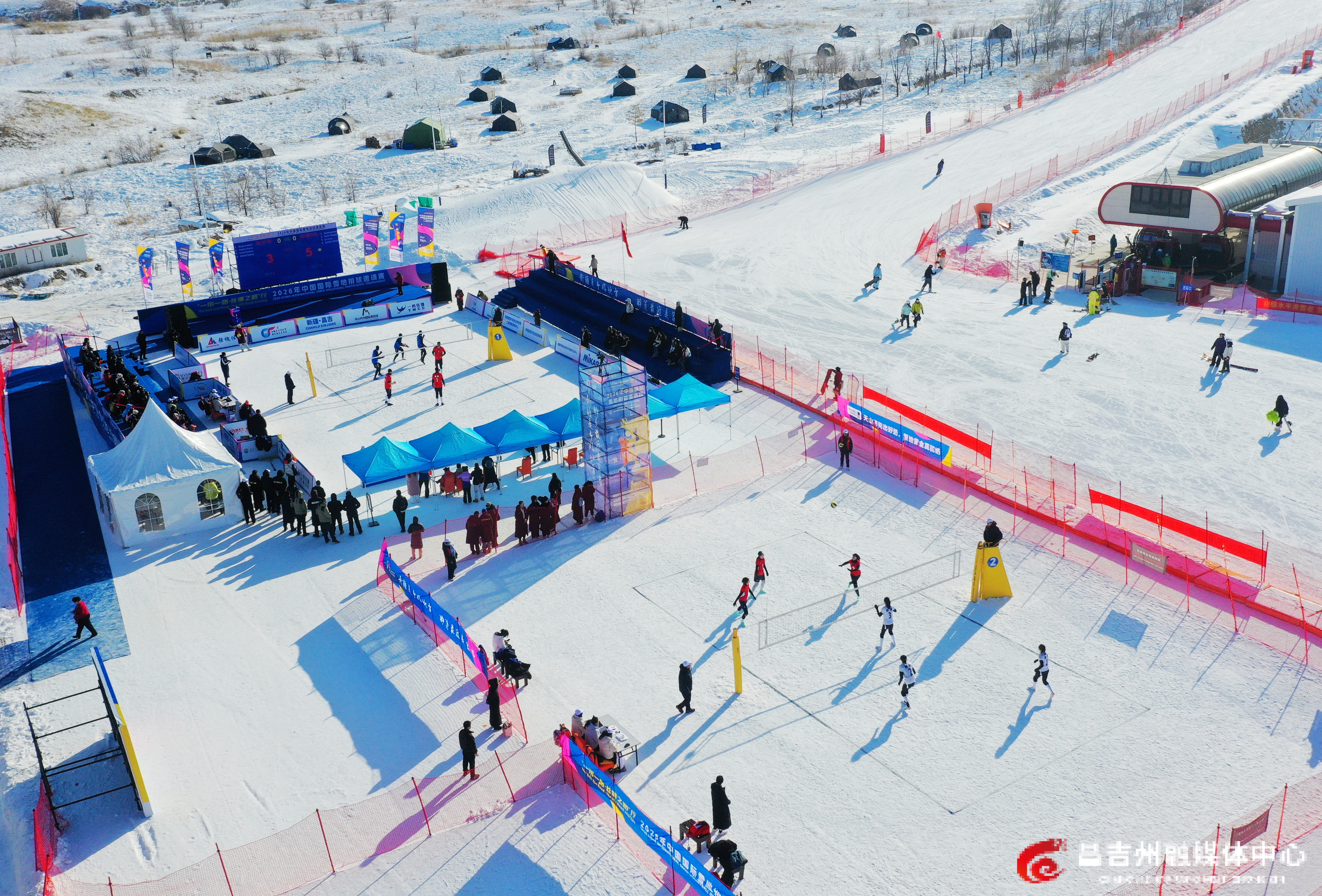 1月22日,阜康市天山天池国际滑雪场,“一带一路·丝绸之路”行2026年中国国际雪地排球邀请赛比赛现场。