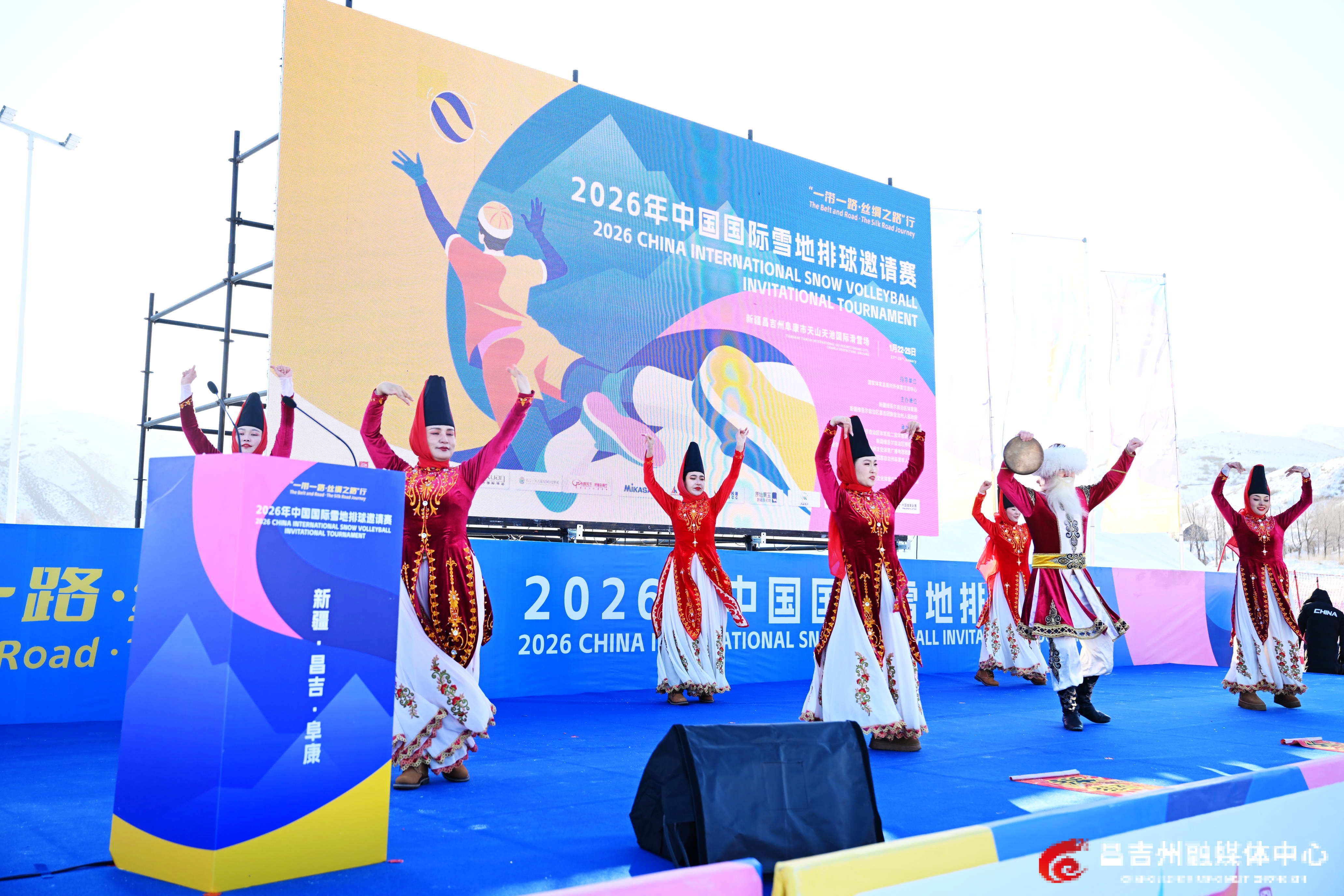 1月22日,阜康市天山天池国际滑雪场,“一带一路·丝绸之路”行2026年中国国际雪地排球邀请赛开幕式现场。