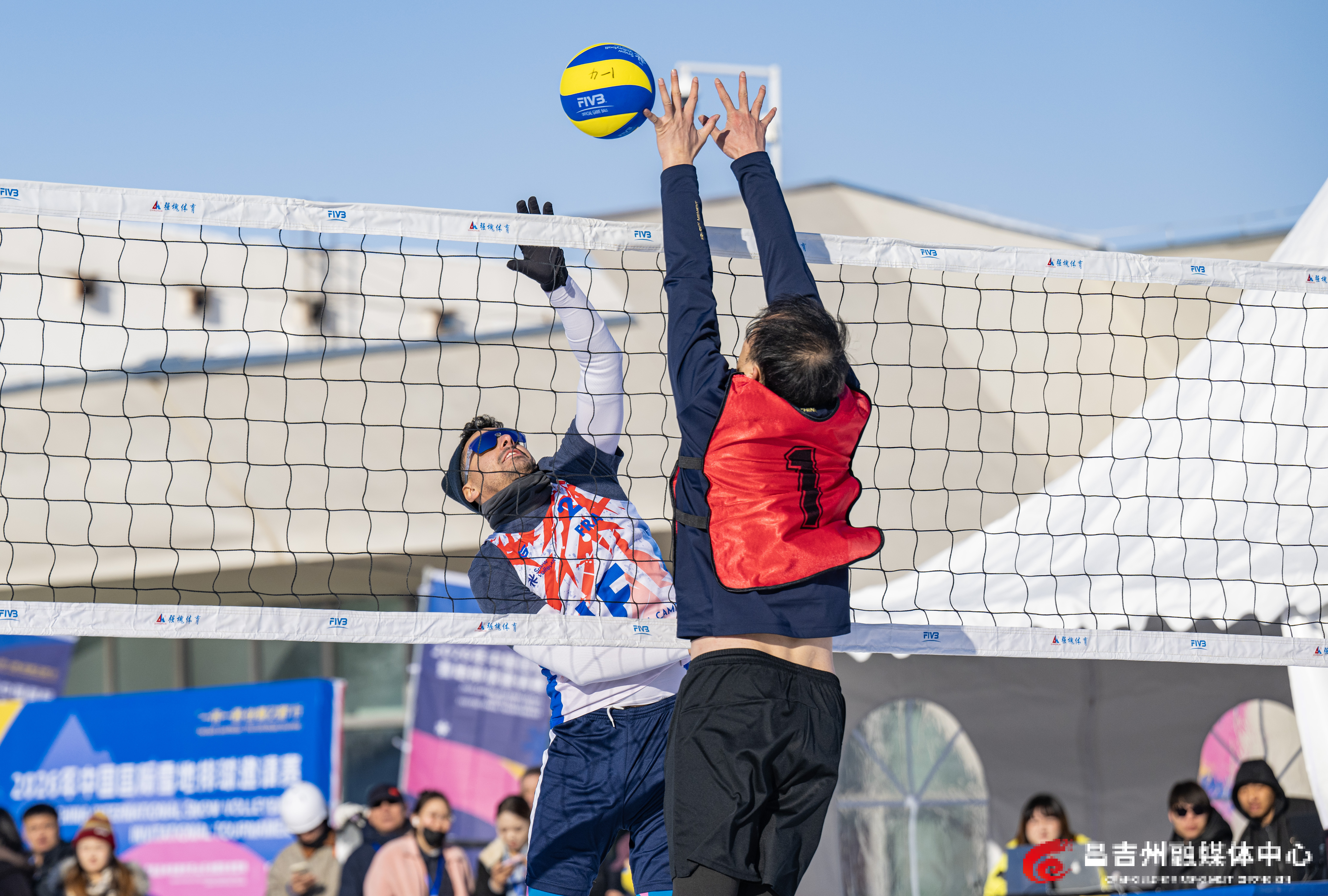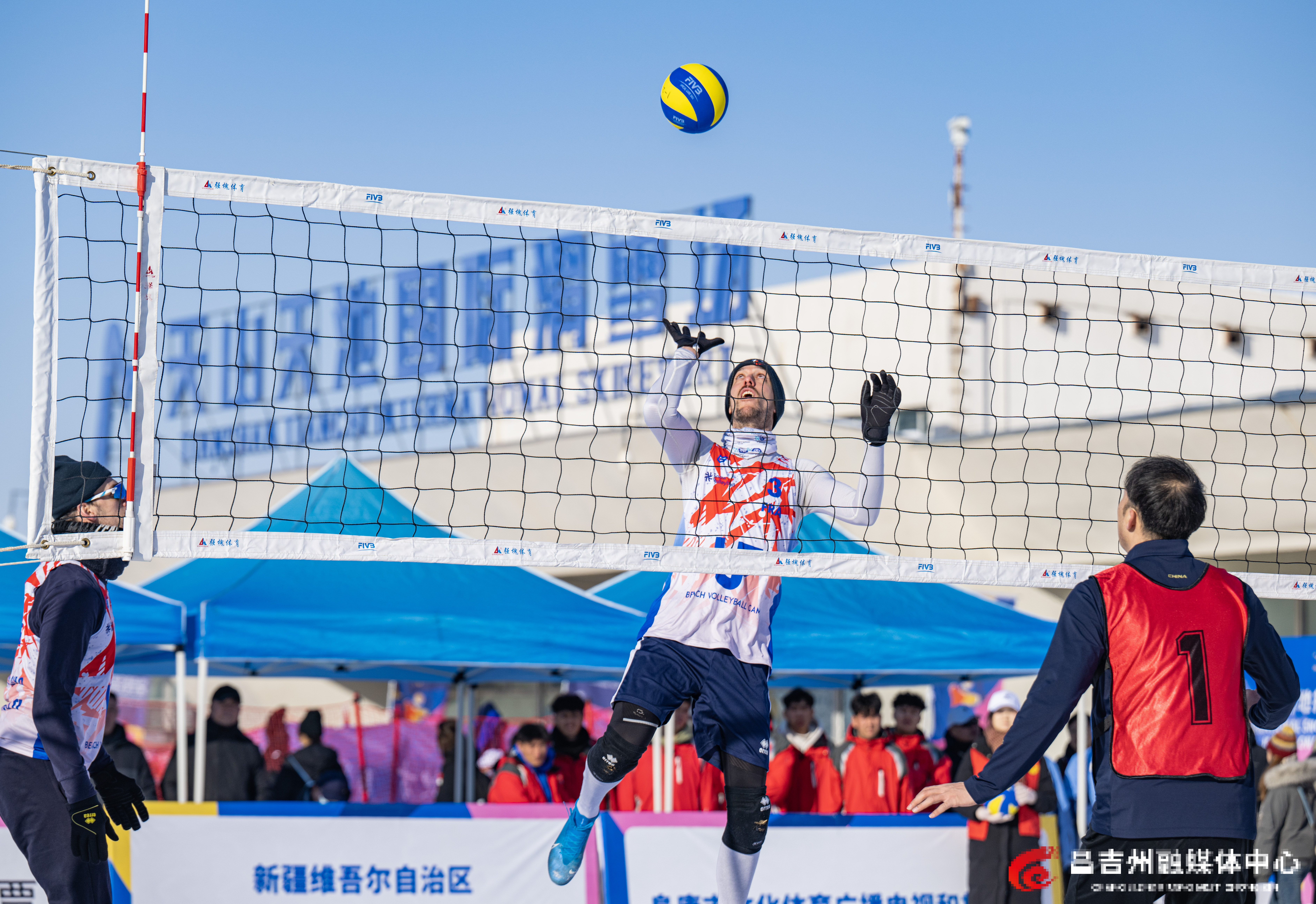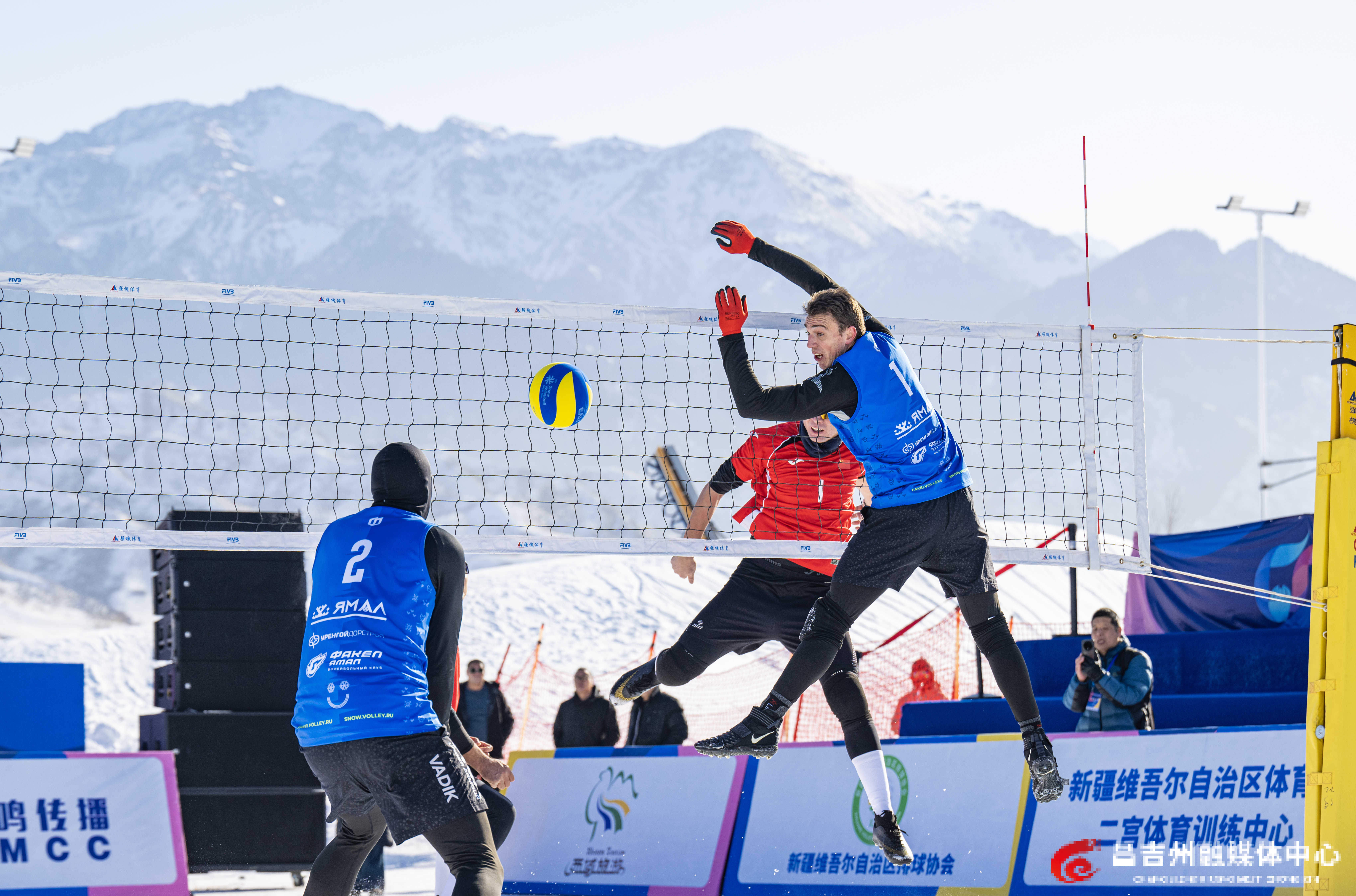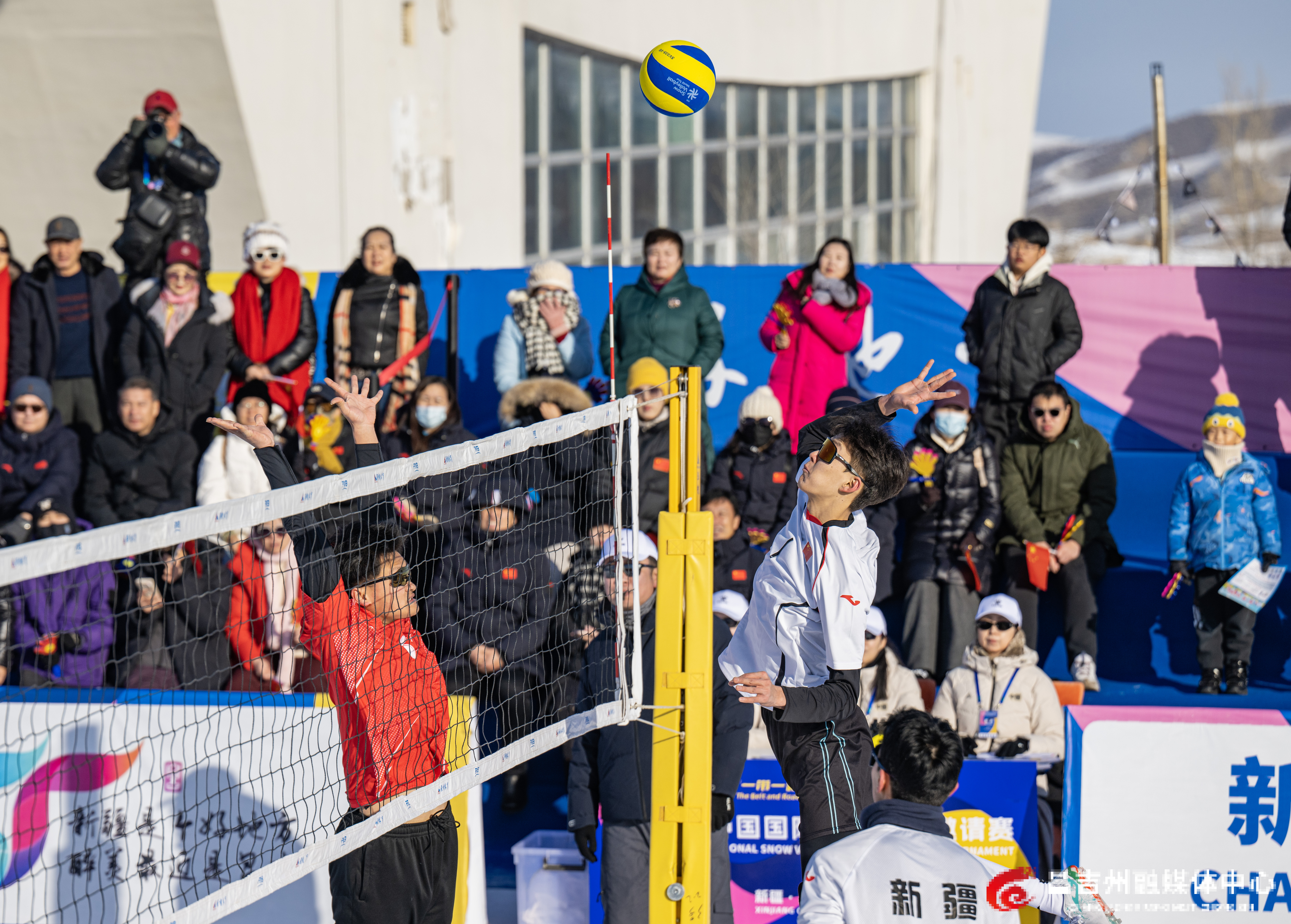 1月22日,阜康市天山天池国际滑雪场,“一带一路·丝绸之路”行2026年中国国际雪地排球邀请赛比赛现场,中国新疆男子一队和俄罗斯队进行比赛。