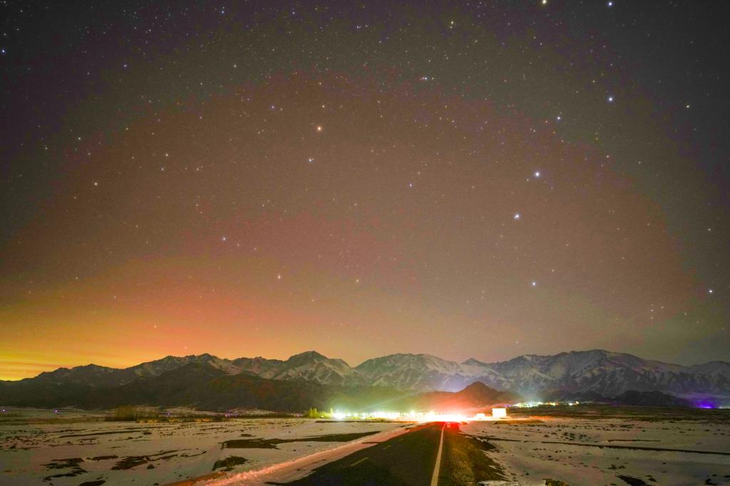同样是在中纬度地区,极光爱好者曹新加就幸运多了。“我在新疆哈密市伊州区西山乡进行了观测,这次极光以红色、橙色和绿色为主。稍显遗憾的是,由于有云层遮挡,未能让这一美景充分展现。”曹新加说。