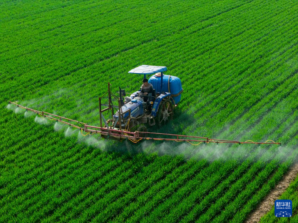 3月25日,河南省三门峡市灵宝市西阎乡西古驿村农民在麦田进行“一喷三防”作业(无人机照片)。新华社发(杜杰摄)