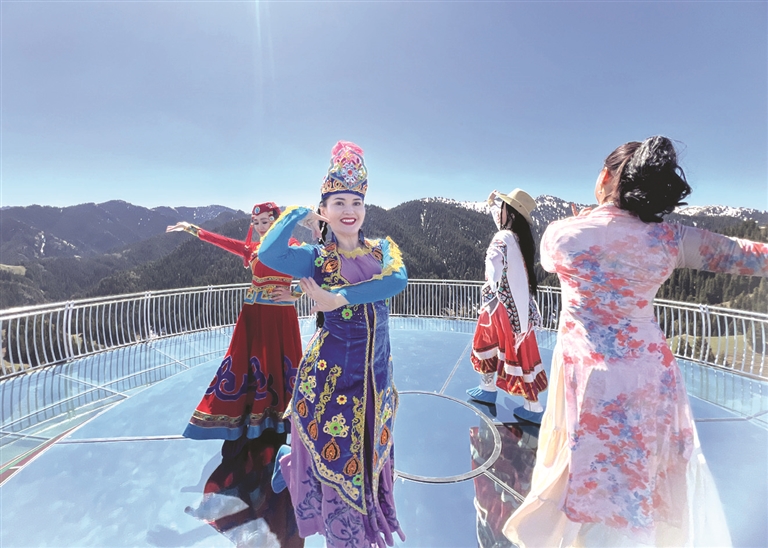 5月1日,在木垒县照壁山乡马圈湾景区,游客在玻璃栈道上翩翩起舞。 记者 巨海成摄