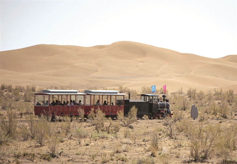 5月1日,在木垒县叶勒森沙漠公园,游客乘坐观光小火车游览沙漠。 记者 巨海成摄
