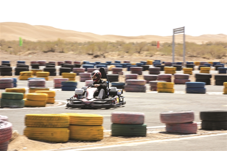 5月1日,在木垒县叶勒森沙漠公园,游客正在体验惊险刺激的卡丁车项目。 记者 巨海成摄