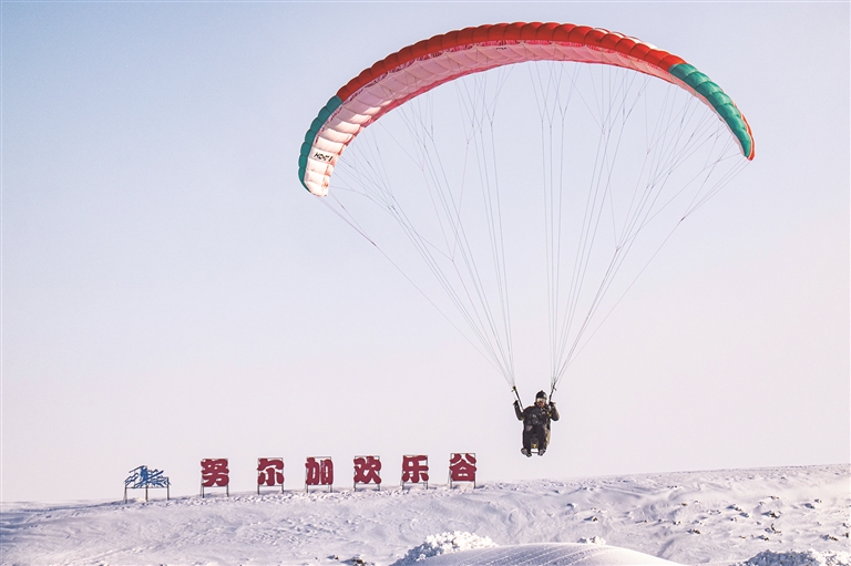 12月14日,昌吉市努尔加滑雪场,游客在体验滑翔伞。记者 何 龙摄