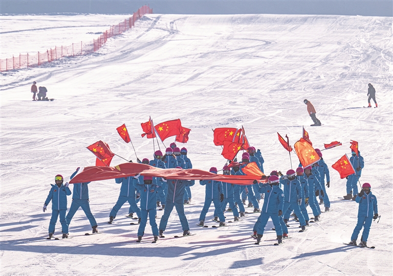 12月14日,昌吉市努尔加滑雪场,国旗方阵从雪道滑下。记者 何 龙摄