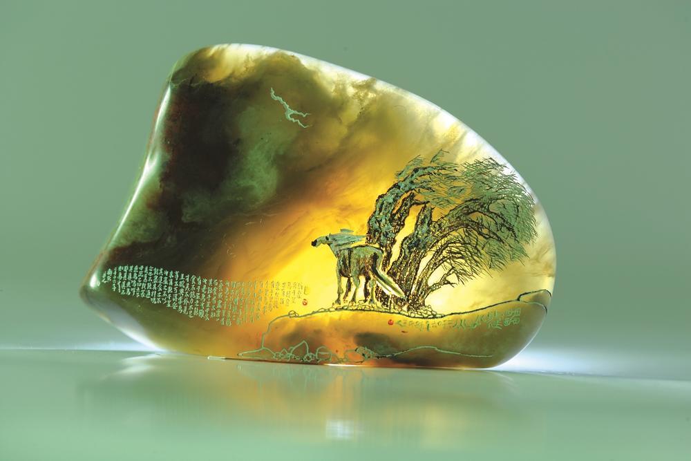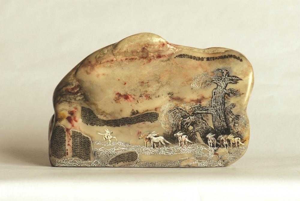 “熔古今为一炉,汇微雕书画于一石”的独门绝技在邹氏父子的微雕作品中展示得淋漓尽致。他们用刻刀、刻针将大漠孤烟、塞上明驼、一川碎石、西风烈马、天山明月等丝路文化展示于方寸玉石之上,为作品注入了灵魂。为此,父子俩经常去观察动物,了解它们的生活习性,还走遍天山南北,从大自然中汲取灵感。此外,他们还从一部部经典文学作品中获得很多滋养。目前为止,父子俩合作创作约500件作品。