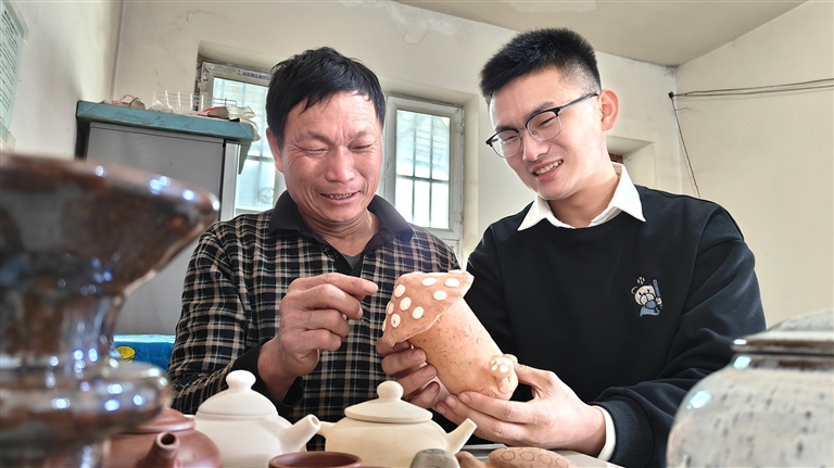 牛金鹿(右一)与父亲牛喜亮探讨素陶蘑菇屋的品相。□刘鑫承摄