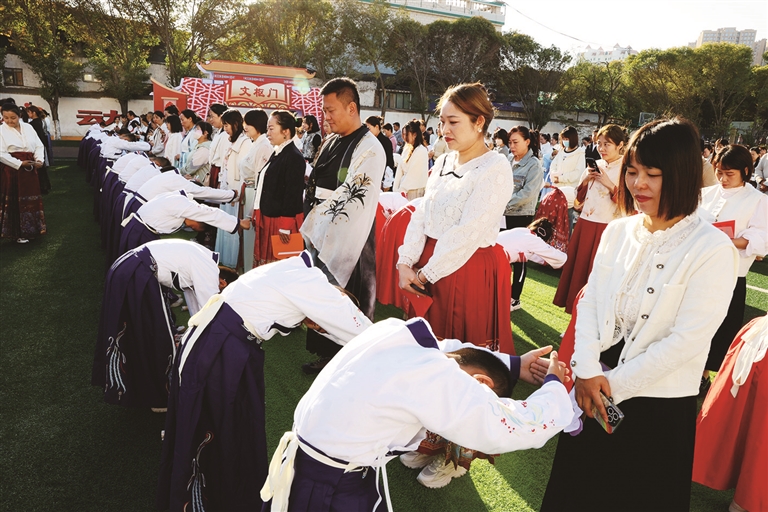 10月10日的成长礼上,孩子给父母行鞠躬礼。□梁宏涛摄