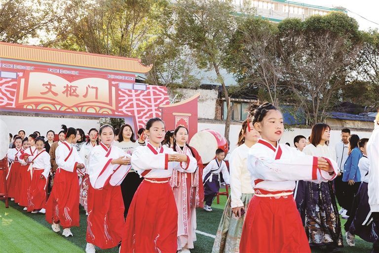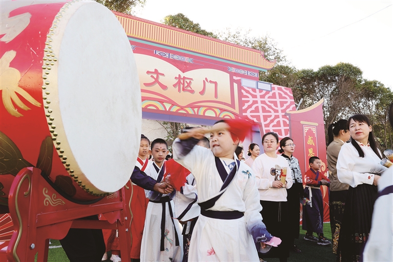 10月10日,身着汉服的孩子出旗击鼓。□梁宏涛摄