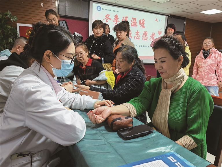 近日,昌吉市建国路街道电力社区和昌吉州福昌社会工作服务中心联合举办礼敬志愿者活动,50位电力社区的志愿者参加活动。 图为新疆赫迩思瑞医院的医生为电力社区的志愿者义诊。 □记者 马晓芳摄