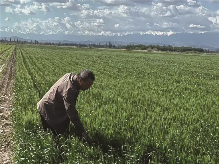 图为庆阳湖乡农业发展中心技术人员在冬小麦种植田查看小麦生长情况。□程 枭摄