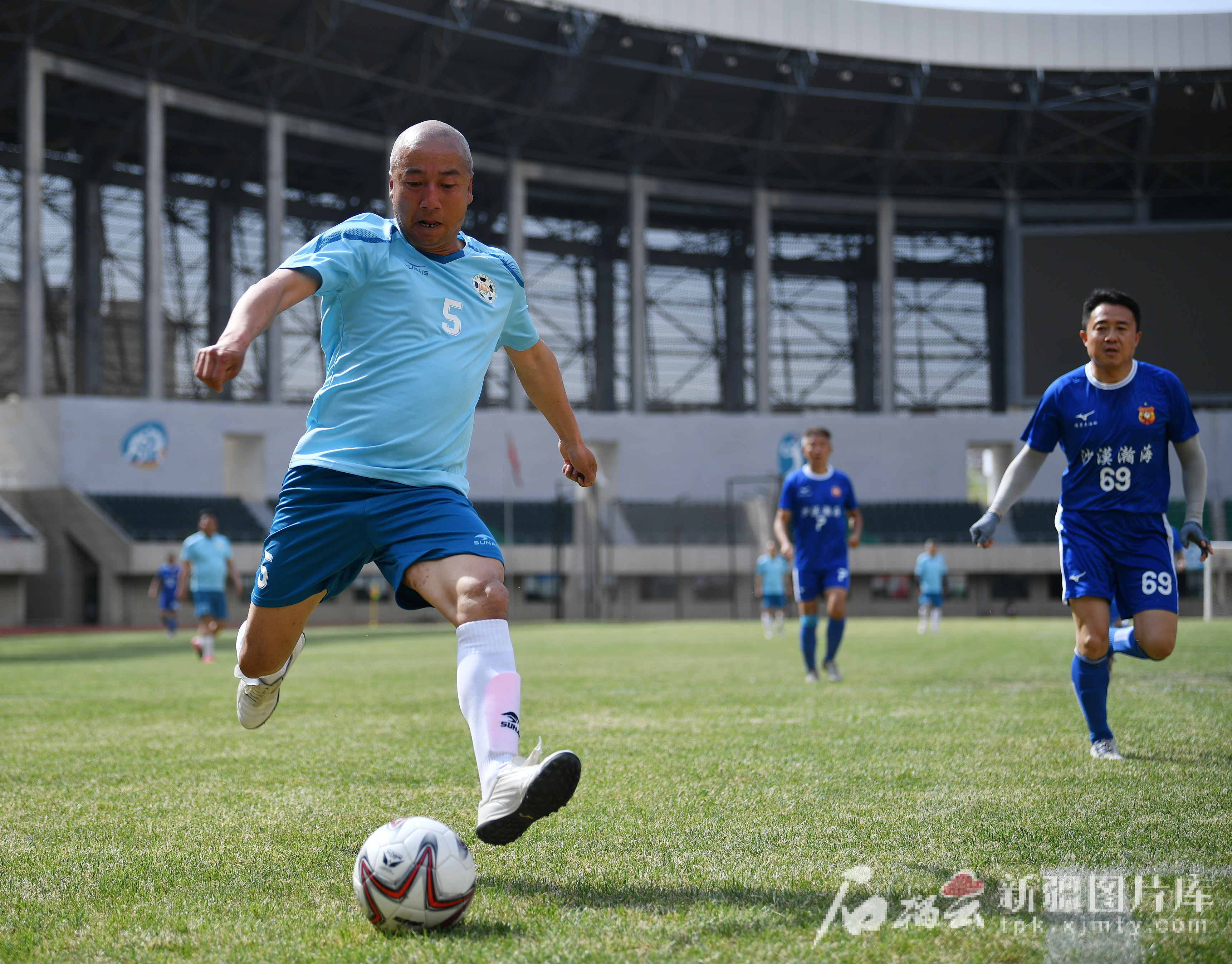 5月1日,参加首场比赛的昌吉足协元老队队员射门。
