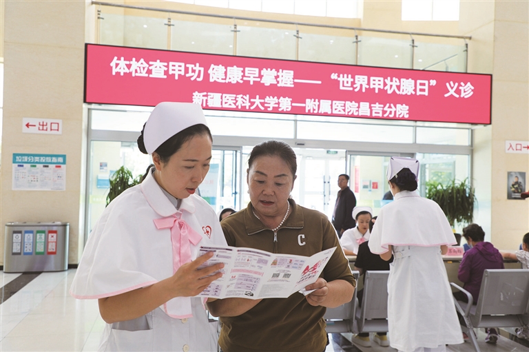 近日,新医大一附院昌吉分院开展“世界甲状腺日”义诊活动。图为医护人员为群众普及预防甲状腺疾病相关知识。□路晓丽摄
