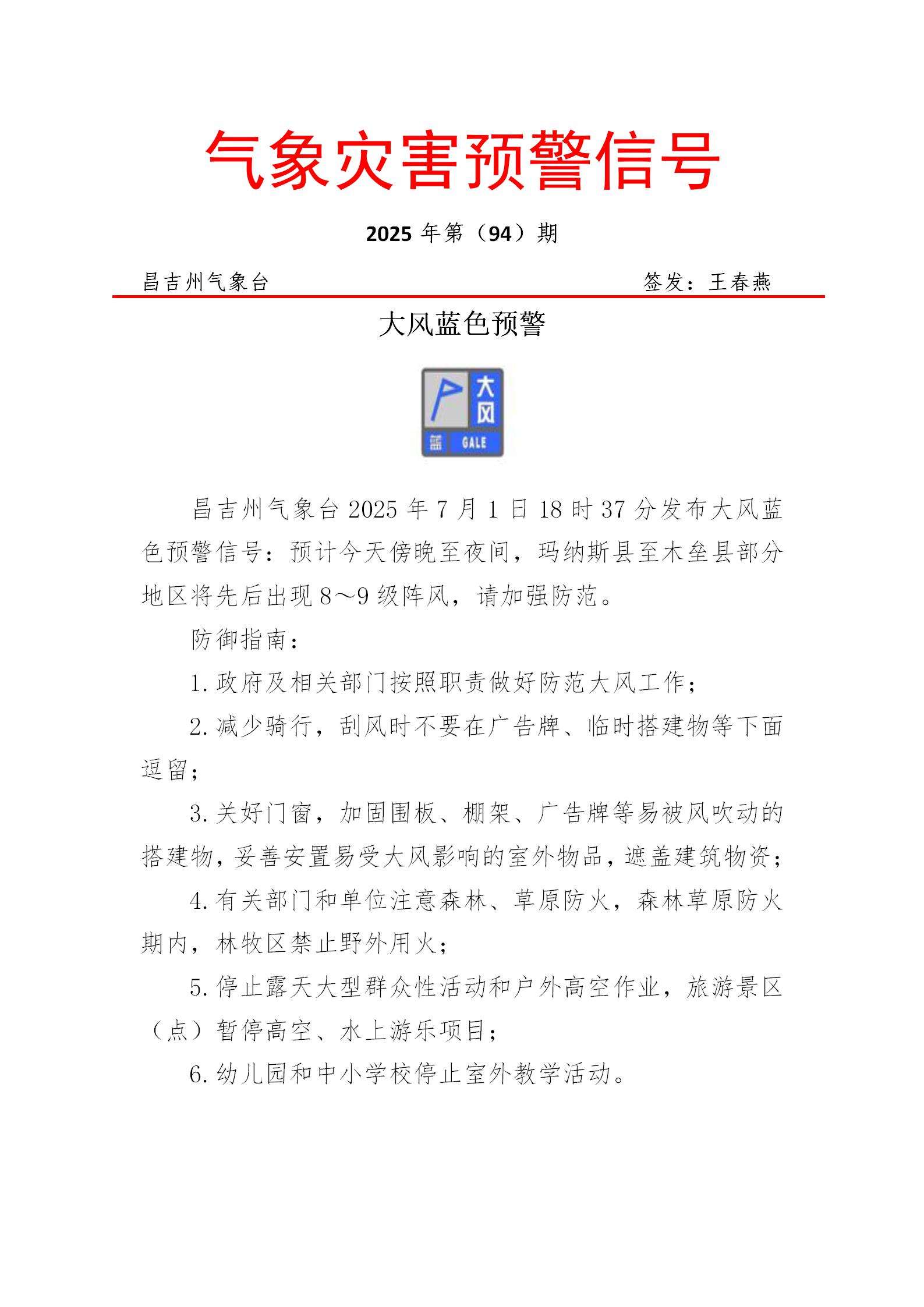 A+ A. A-昌吉州气象台2025年7月1日18时37分发布大风蓝色预警信号:预计今天傍晚至夜间,玛纳斯县至木垒县部分地区将先后出现8~9级阵风,请加强防范。