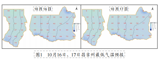 预计,10月13日午后至14日夜间,大部地区小雨(山区为雪),玛纳斯县至昌吉市农区部分地区中雨,部分山区中雪,呼图壁县雀尔沟镇至昌吉市阿什里乡、阜康市三工河乡至吉木萨尔县泉子街镇山区局地暴雪,西北风4~5级。15日,阜康市至木垒县部分地区小雨(山区为雪)。10月16日至19日,大部地区晴间多云,气温维持较低,其中16日、17日清晨,平原最低温度-5℃~-2℃,山区最低温度-10℃~-6℃,大部地区将出现不同程度的霜冻。