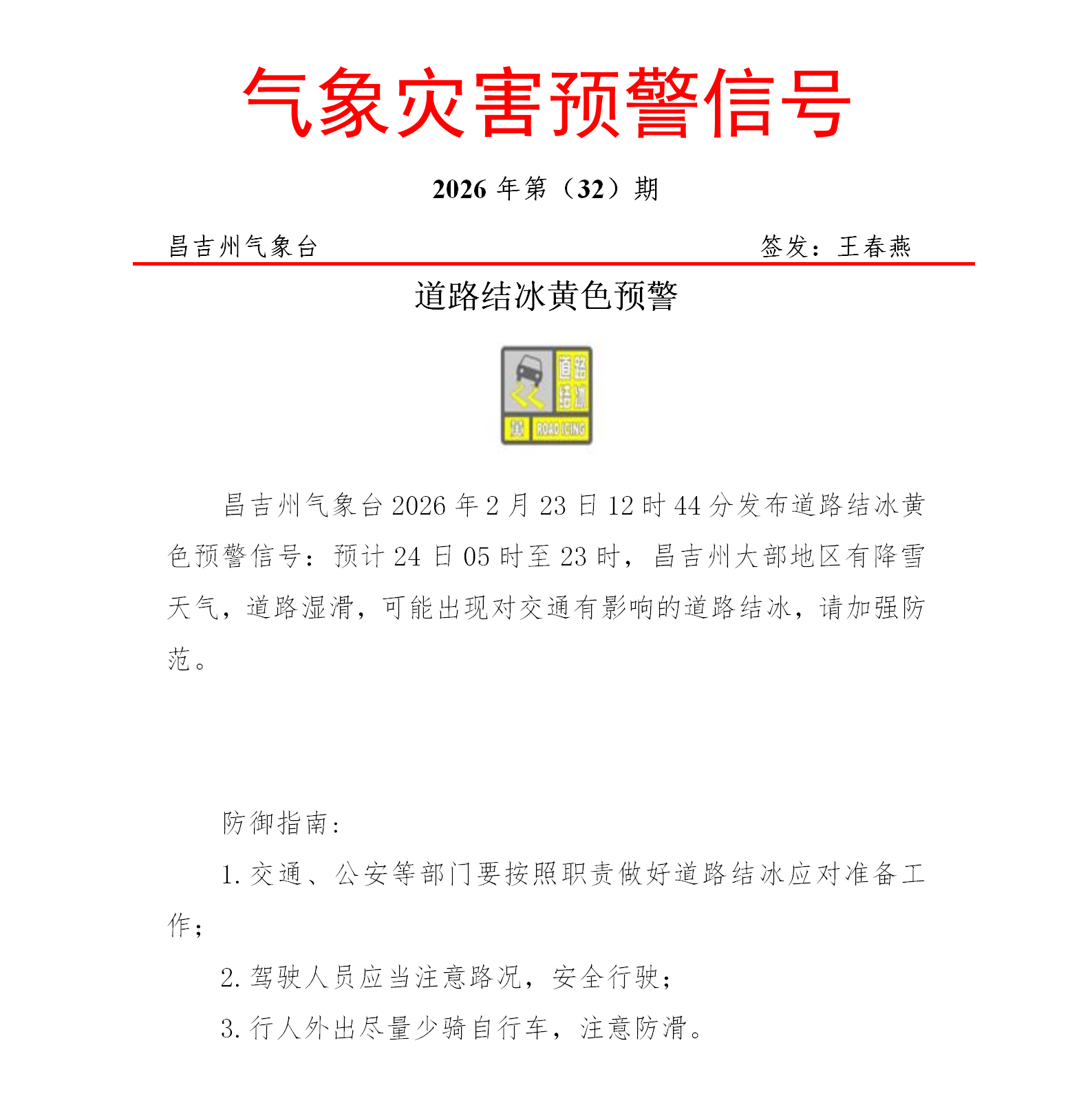 昌吉州气象台2026年2月23日12时44分发布道路结冰黄色预警信号:预计24日05时至23时,昌吉州大部地区有降雪天气,道路湿滑,可能出现对交通有影响的道路结冰,请加强防范。