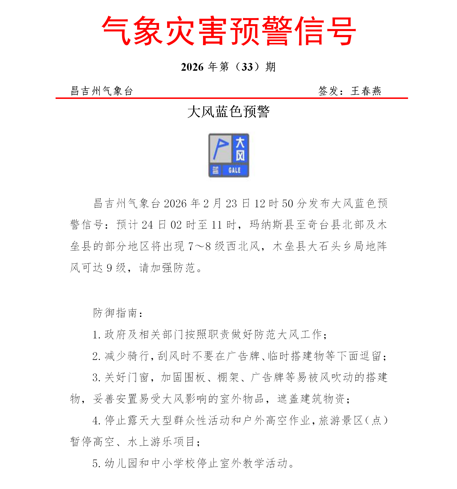 昌吉州气象台2026年2月23日12时50分发布大风蓝色预警信号:预计24日02时至11时,玛纳斯县至奇台县北部及木垒县的部分地区将出现7~8级西北风,木垒县大石头乡局地阵风可达9级,请加强防范。