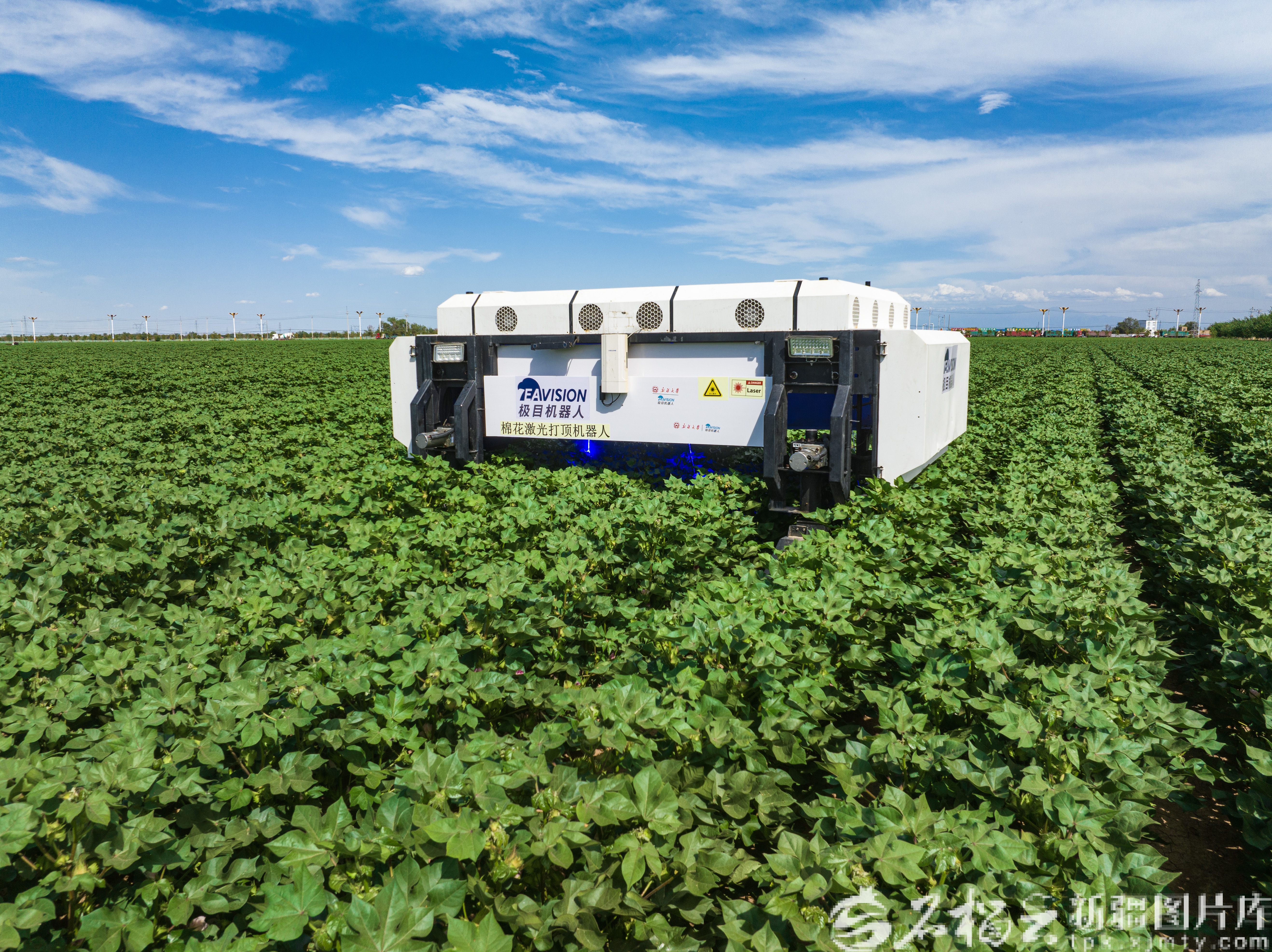 7月23日,昌吉市榆树沟镇榆树沟村棉田里,棉花激光打顶机器人正在作业,其棉花顶芽识别准确率达 98.9%。何龙摄