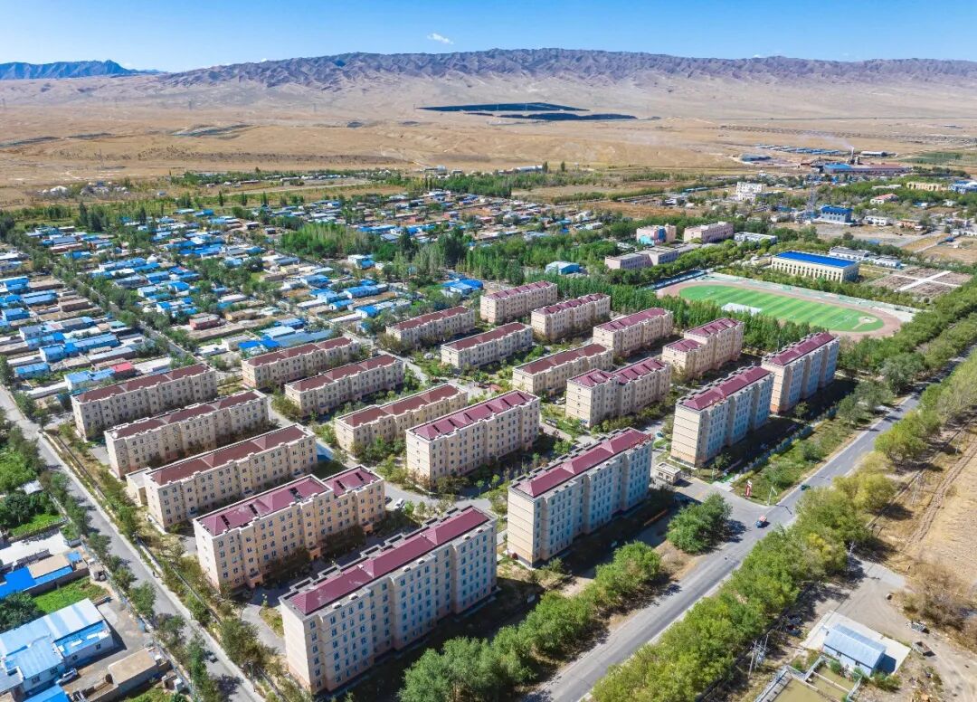 2025年8月26日,昌吉市阿什里乡“天鹅小镇”小区,一排排整齐的楼房坐落在天山脚下。资料图片