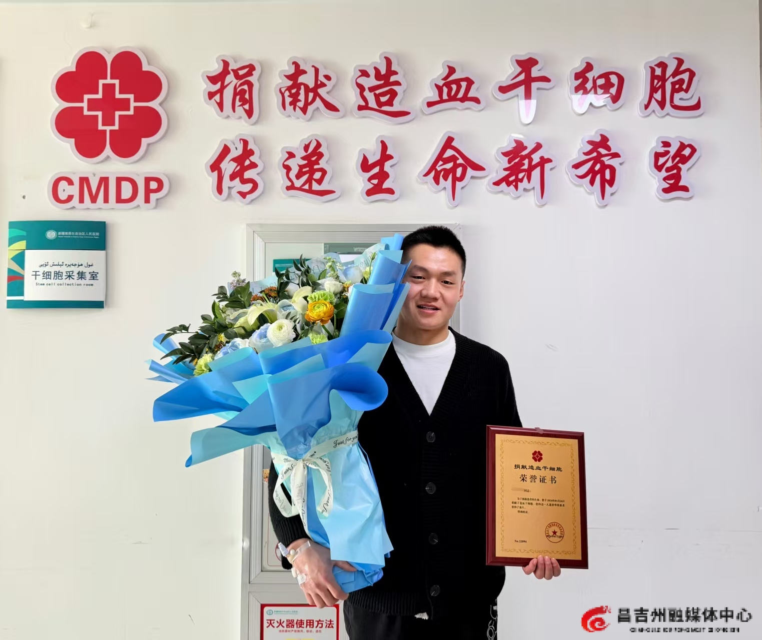 1月26日,毛小龙安静地躺在病床上,鲜红的血液经过导管缓缓流入血细胞分离机,经过分离、提取,最终汇聚成珍贵的造血干细胞混悬液。自治区、昌吉州、阜康市红十字会工作人员到场慰问,并为他颁发荣誉证书,送上鲜花。他也成为了新疆2026年首例造血干细胞捐献者。