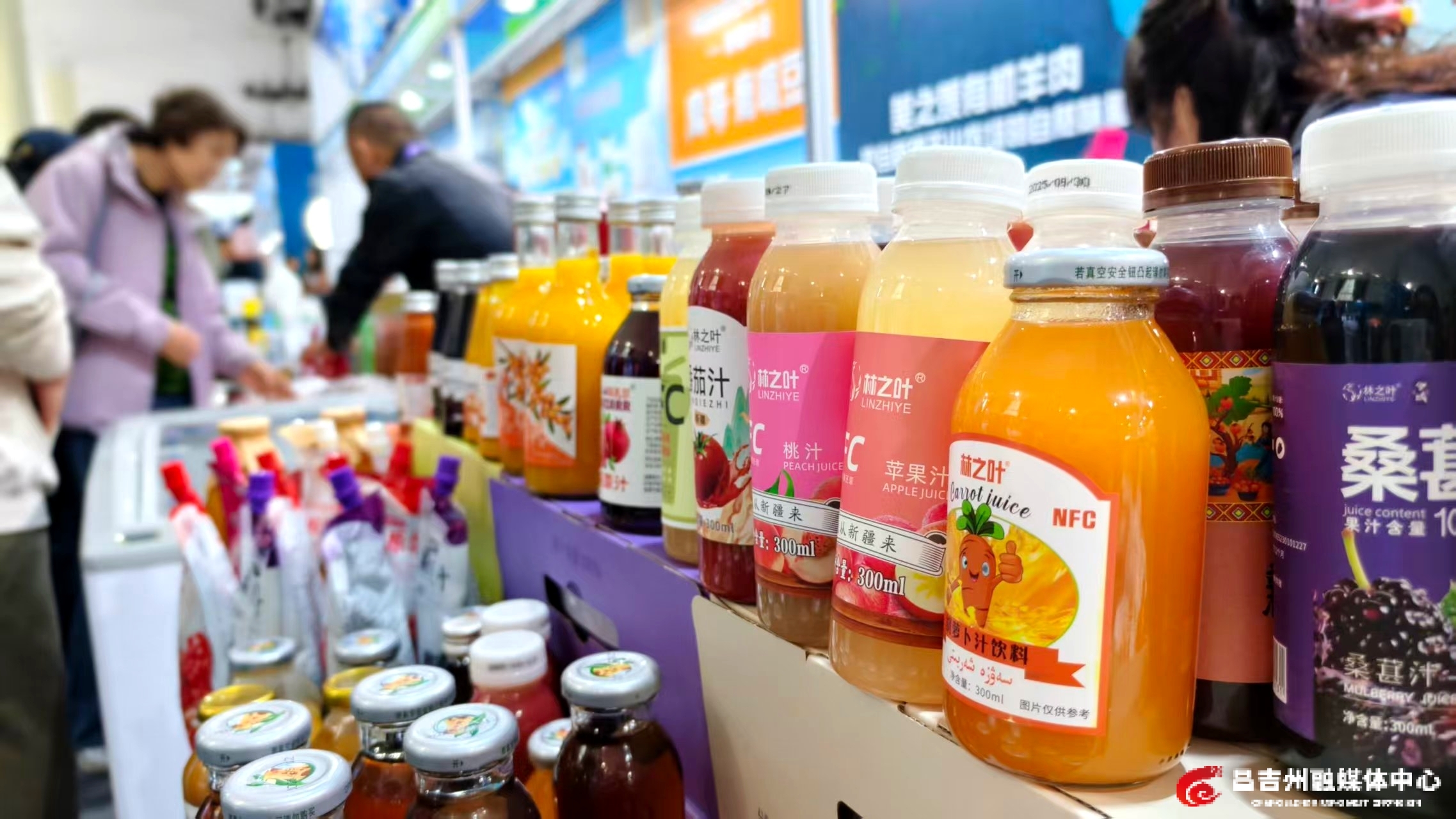昌吉州展区装饰装修特色鲜明,天山天池的碧水荡漾,丹霞地貌一片赤红色,与货架上番茄酱的鲜红、鹰嘴豆的浅黄、酸奶的纯白相映成趣,勾勒出昌吉州农牧业高质量发展的鲜活图景。