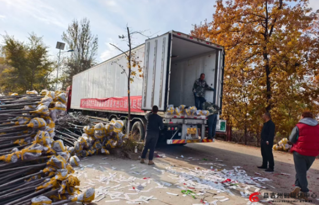 10月28日,在呼图壁县苗木种植基地里,1万棵紫叶稠李苗木完成检疫,整装启运,发往哈萨克斯坦阿拉木图市。 图片由昌吉州商务局提供