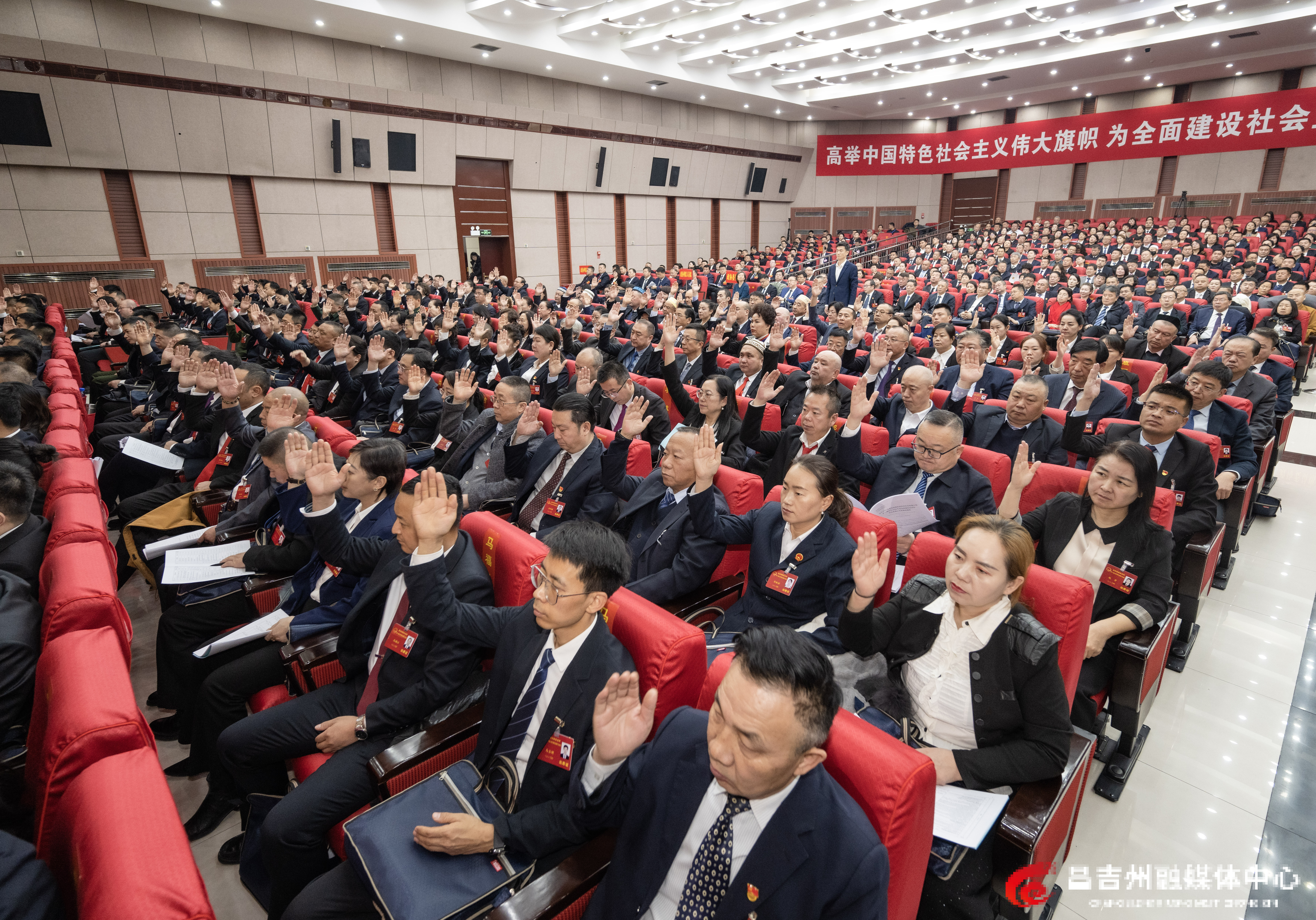 1月20日上午,昌吉回族自治州第十六届人民代表大会第六次会议开幕,代表举手表决有关事项。