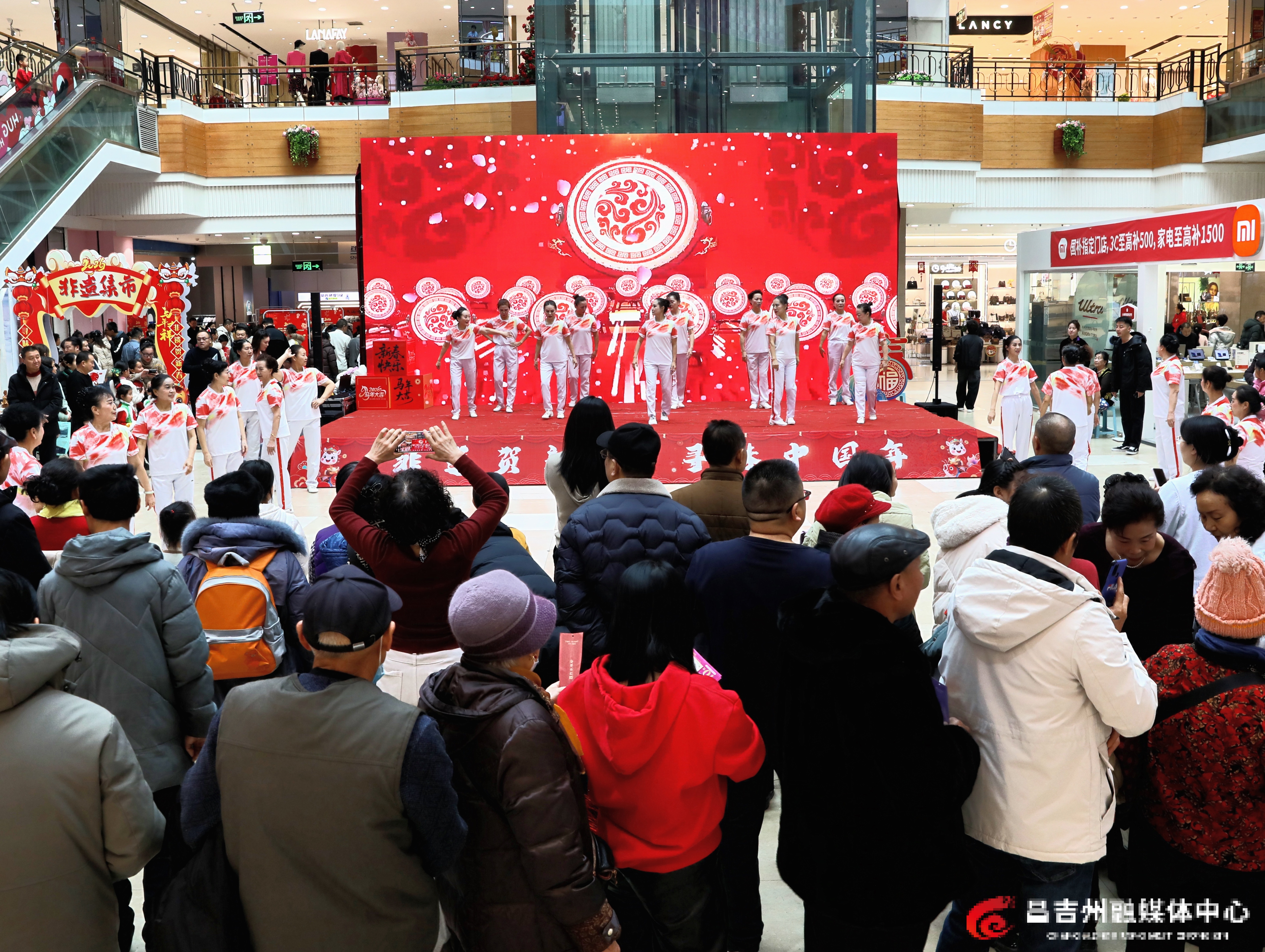 1月31日,昌吉州“新疆是个好地方”——第十三届天山南北贺新春非物质文化遗产年俗展主场活动在昌吉市东方广场启幕。图为活动现场的广场舞表演。记者许乐 摄