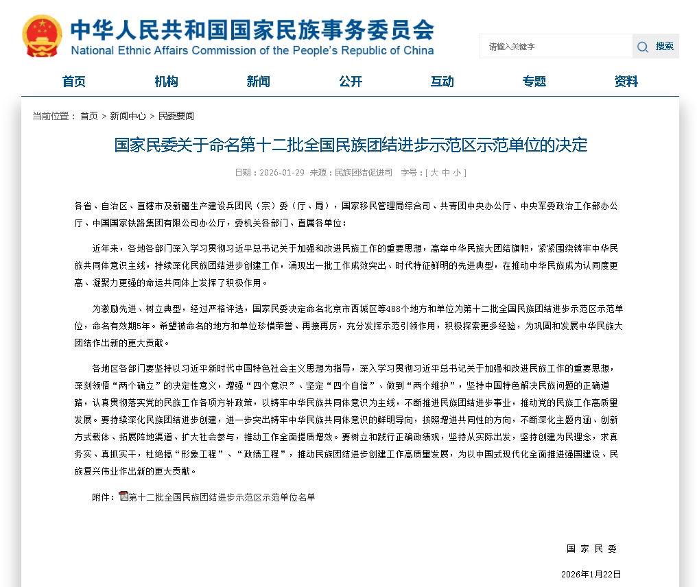 A+ A. A-丝路昌吉/昌吉州融媒体中心讯(记者 左晓雨 王薇 通讯员 王多荣报道)1月29日,全国民委主任会议在京召开,488个地方和单位被命名为第十二批全国民族团结进步示范区示范单位。昌吉州木垒县、奇台县半截沟镇腰站子村、新疆天龙矿业股份有限公司入选。命名有效期5年。