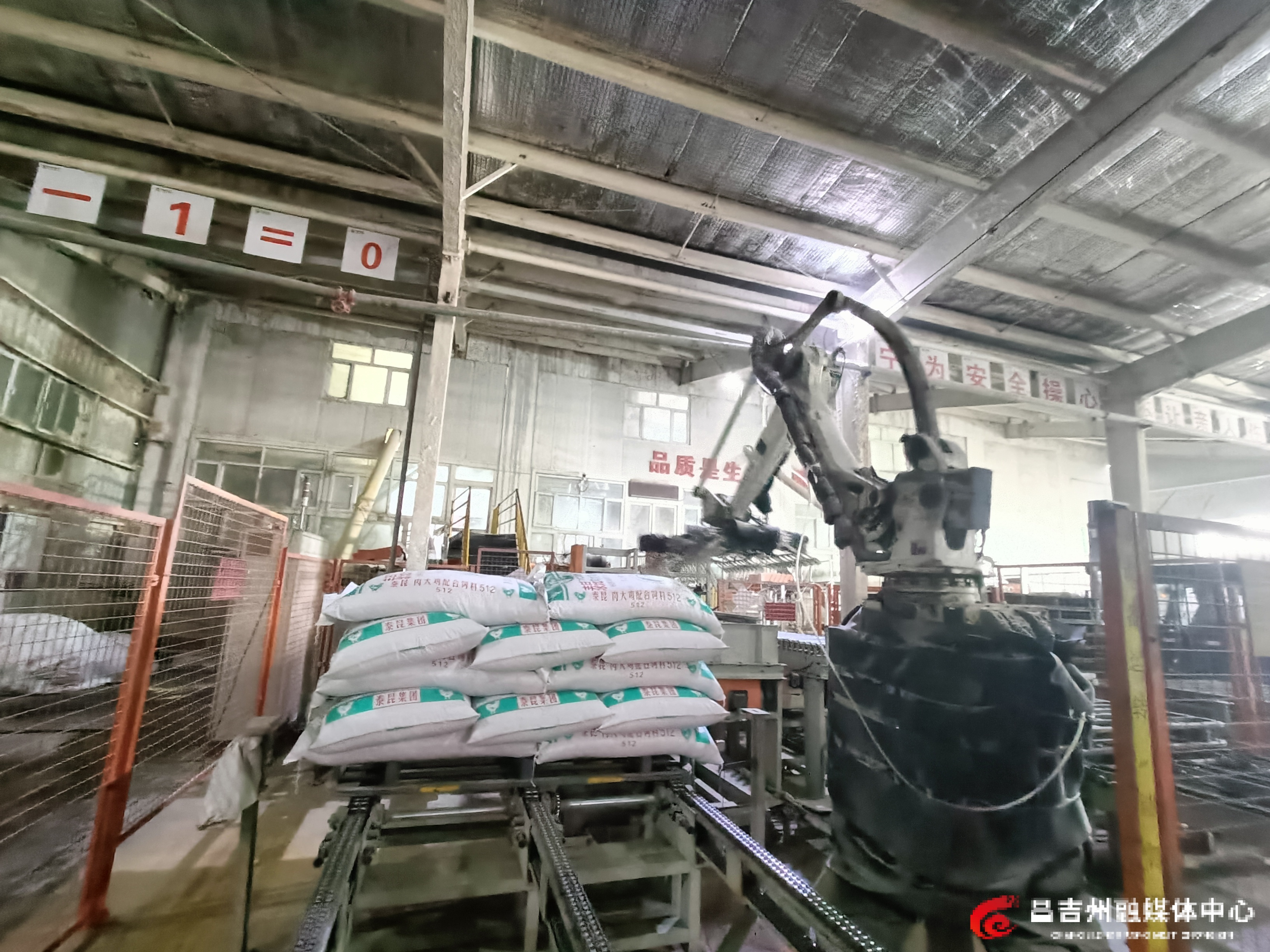 在新疆泰昆集团昌吉饲料有限责任公司生产车间,机械臂正在自动码放饲料袋。记者刘茜 摄