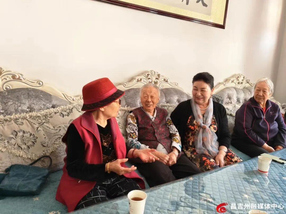 在阜康市阜新街道文化路社区的沙尼汗居家养老中心,沙尼汗·艾塔木(右二)在和老人们一起聊天。资料图片