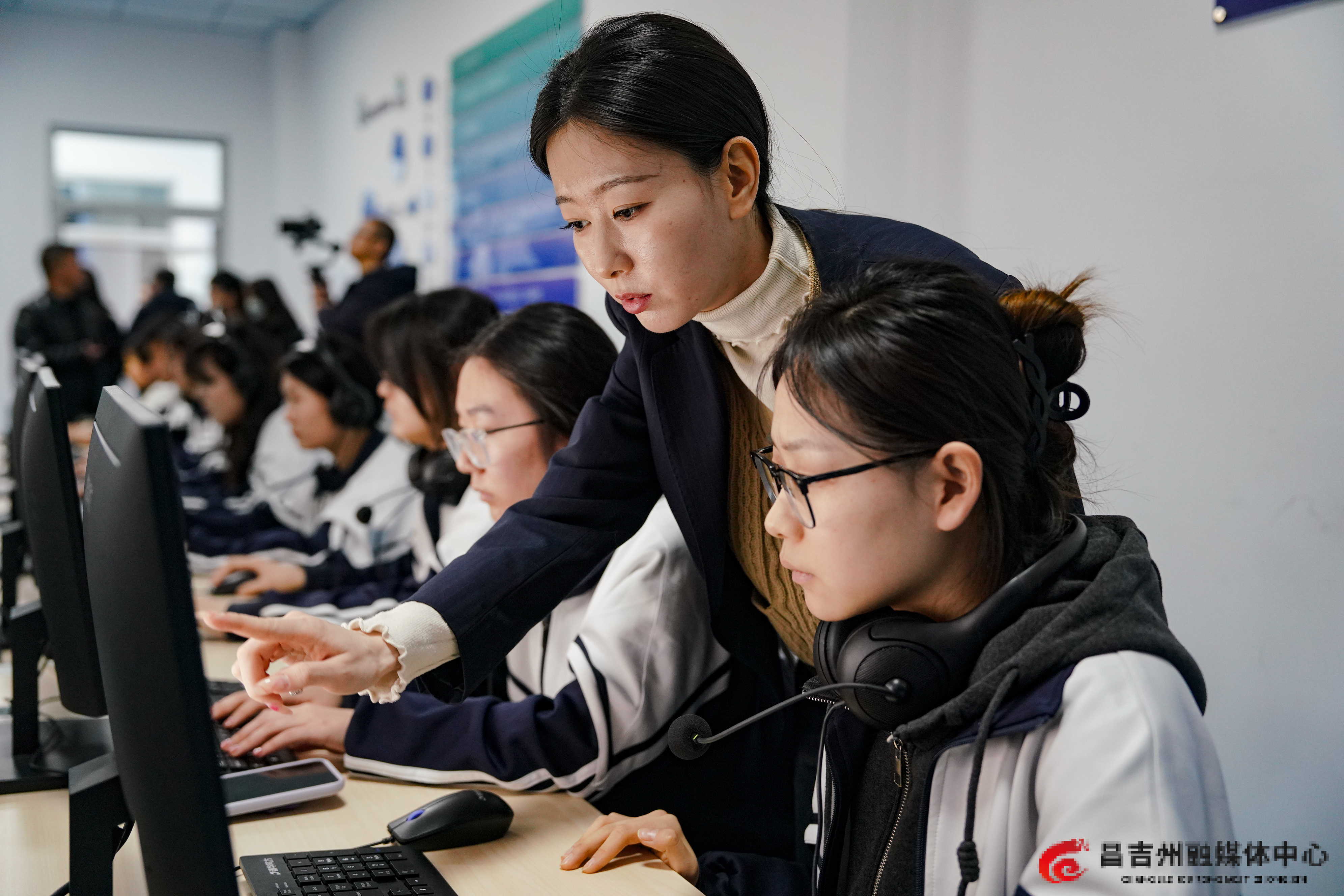 3月14日,昌吉职业技术学院的派格数据标注产业学院多媒体与数字教室,老师正在给学生讲解AI应用。记者常谊谊 摄