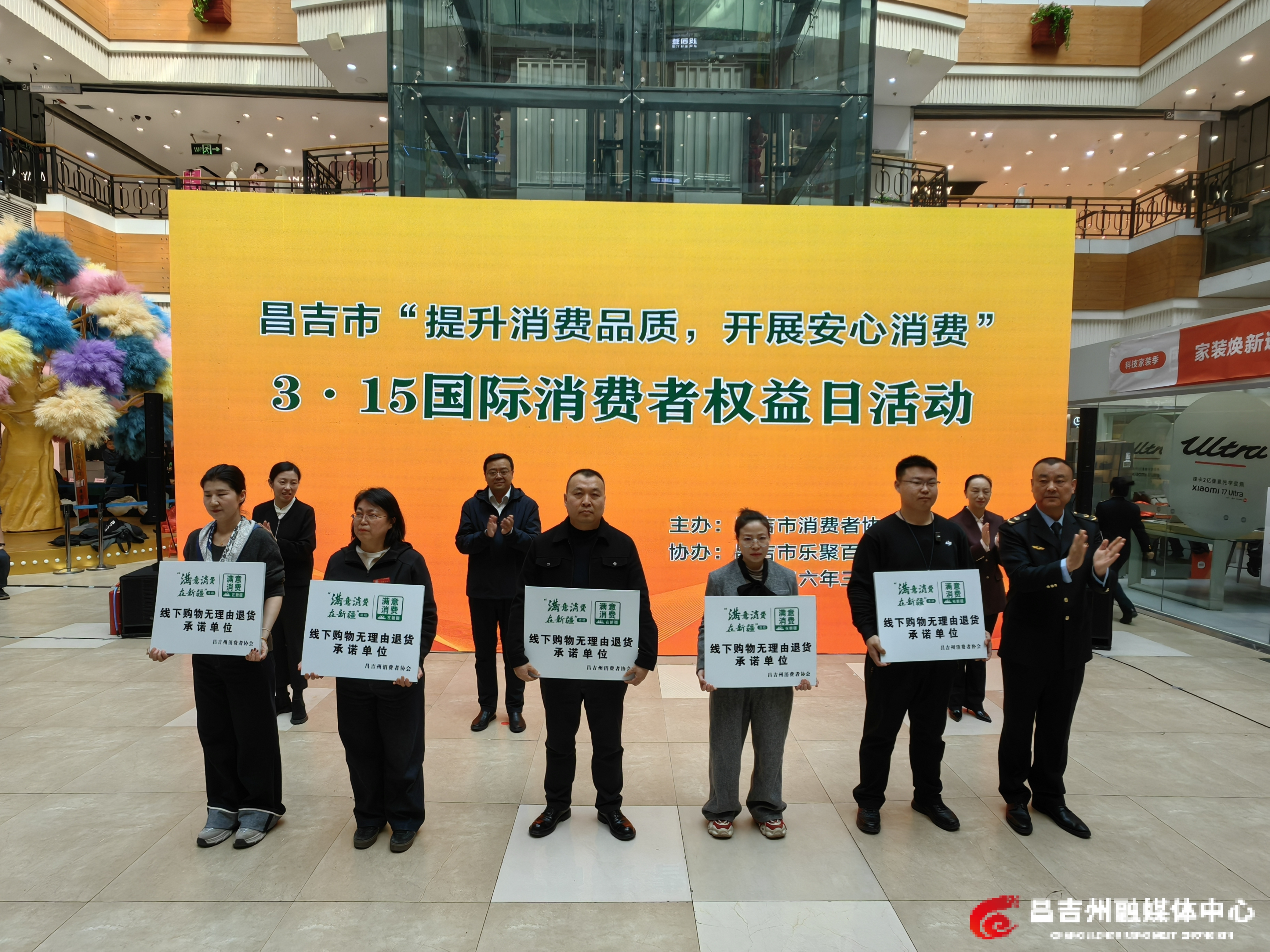 3月15日,昌吉市“提升消费品质,开展安心消费”主题活动现场,昌吉市市场监督管理局为5家单位授予“线下购物无理由退货承诺单位”牌匾。记者荷苒·马汗 摄
