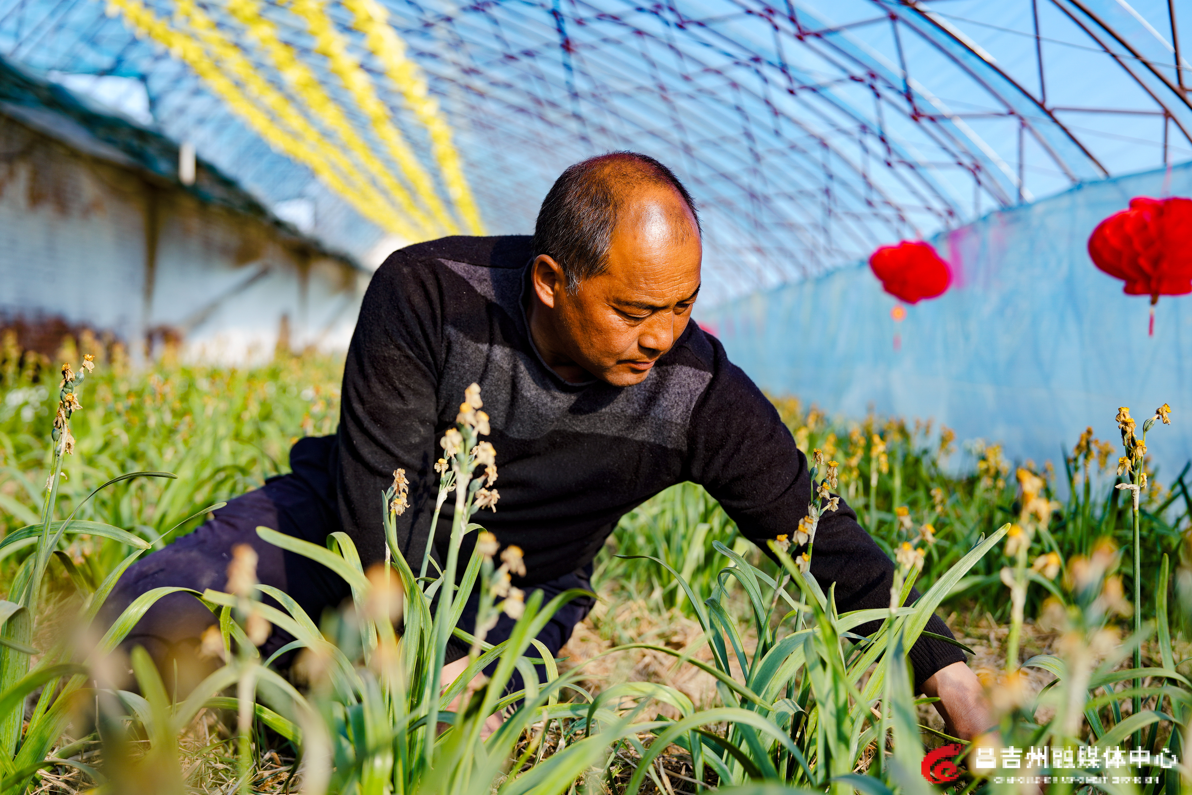 3月16日,木垒县木垒镇水仙花种植大棚内,种植工人徐亚新正在处理杂草。记者常谊谊 摄