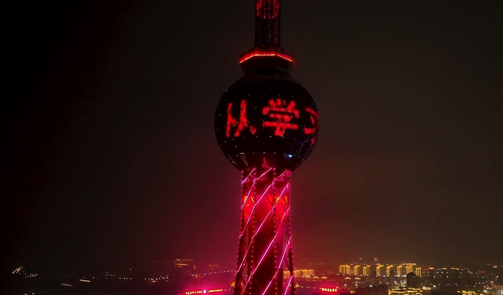 2025年12月25日晚,新疆阿克苏多浪明珠广播电视塔上,“新年,从学习开始”的标语格外醒目。(来源:阿克苏地区融媒体中心提供)