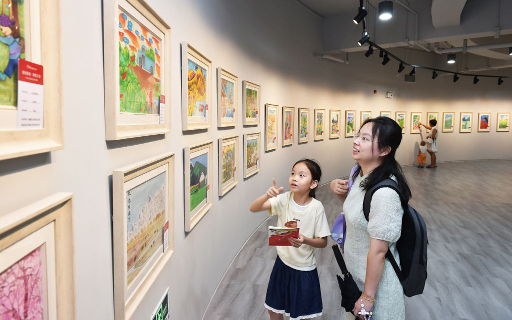 2025年9月29日,“童绘新疆·多彩70年”全国中小学生绘画作品展在上海虹桥当代艺术馆开幕。这是观众在观展。(摄影:努尔夏提·尼加提)